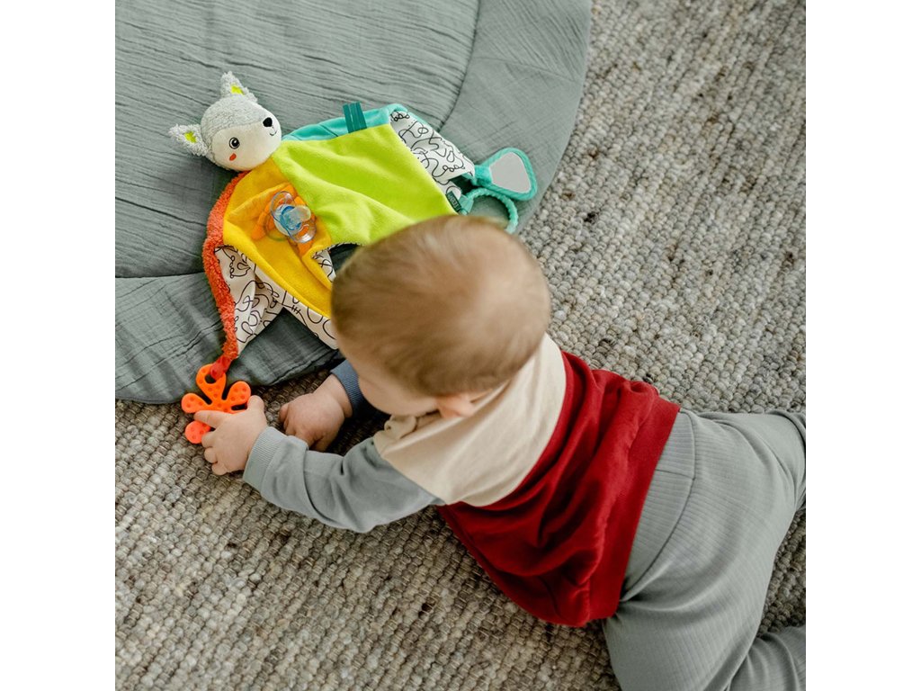 Veľa úchopových prvkov, mäkké materiály a hlavička líšky sú prvky, ktoré stimulujú zmysly bábätka a tým sa dieťatku rozvíja hmat a úchop. Praktický krúžok na cumlík zaistí, že sa cumlík nestratí pri žiadnom dobrodružstve. Dve mäkké hryzátka v neónovo oranžovej a žltej farbe pomáhajú s prerezávaním zúbkov.