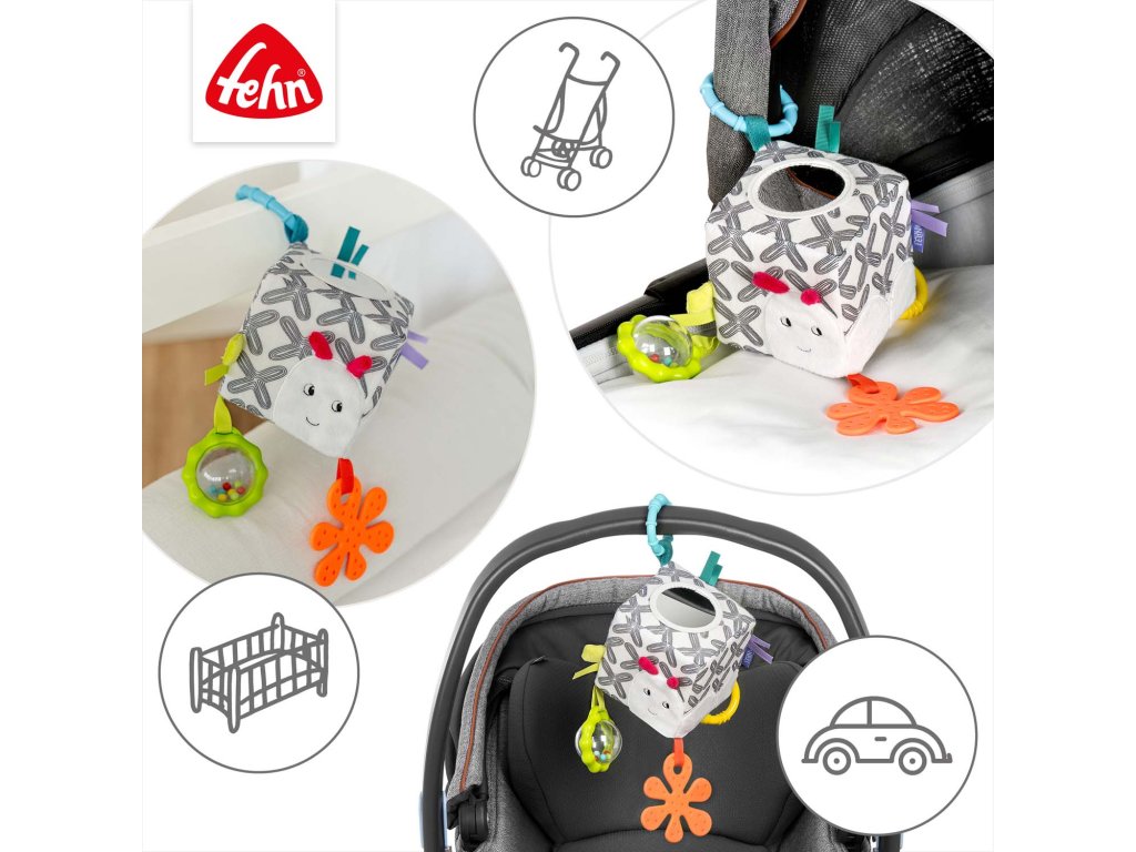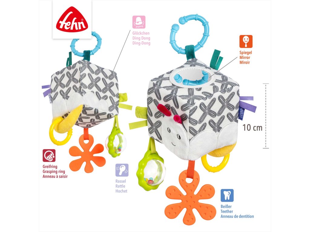 Výrazné čiernobiele kontrasty, jasné farby a kombinácia rôznych materiálov hravou formou podporujú senzorimotorický vývoj bábätka. Vďaka praktickému C-krúžku možno túto všestrannú interaktívnu kocku jednoducho pripevniť kamkoľvek a rýchlo sa stane verným spoločníkom vášho dieťatka.