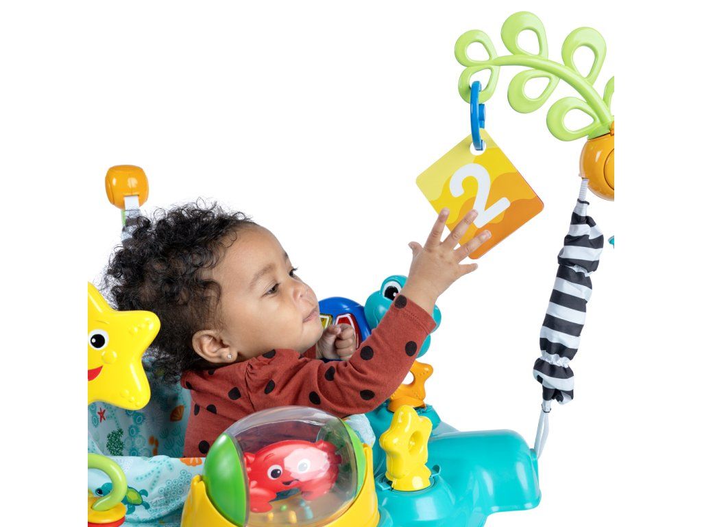 Vďaka otočnému sedadlu o 360° môže bábätko skúmať všetky hračky a aktivity okolo seba. Pri skákaní sa aktivujú svetlá a melódie, ktoré dieťa povzbudzujú k pohybu a objavovaniu. Skákadlo obsahuje aj odnímateľnú elektronickú hračku Neptune the Turtle, ktorú možno používať samostatne na podlahe alebo na cestách.
