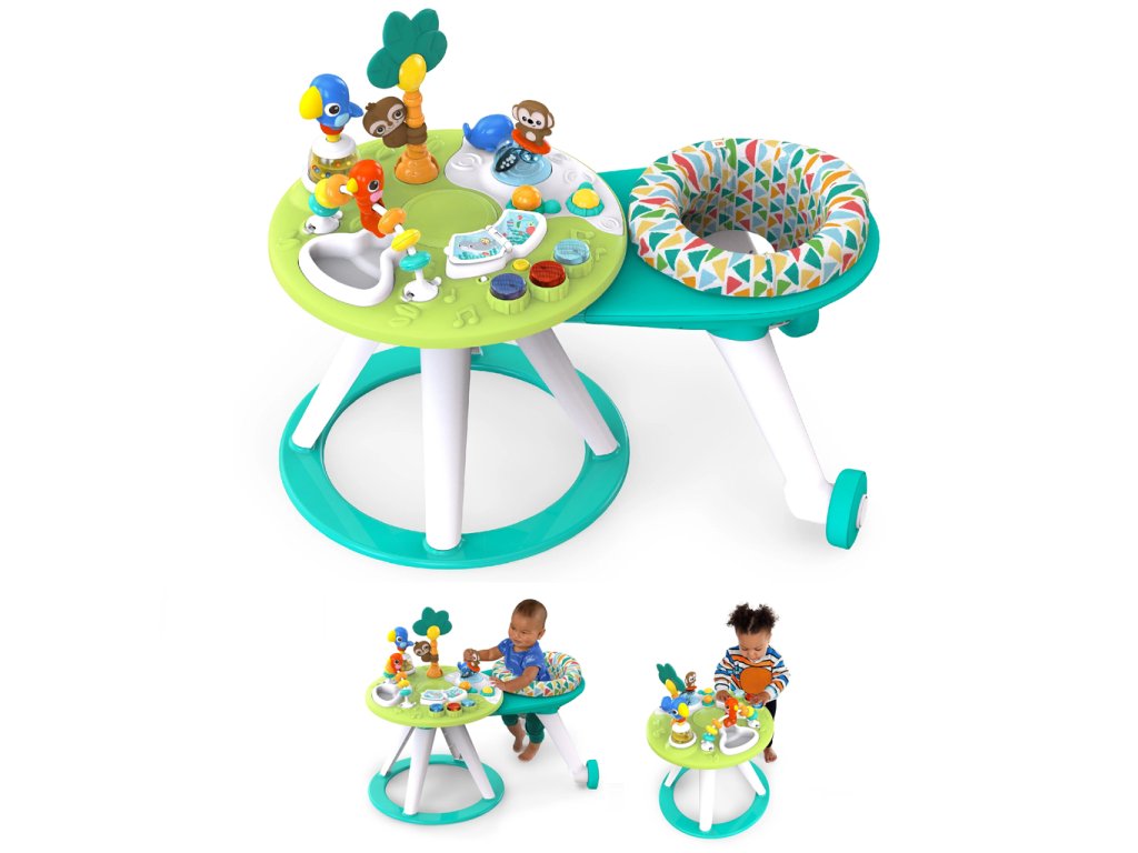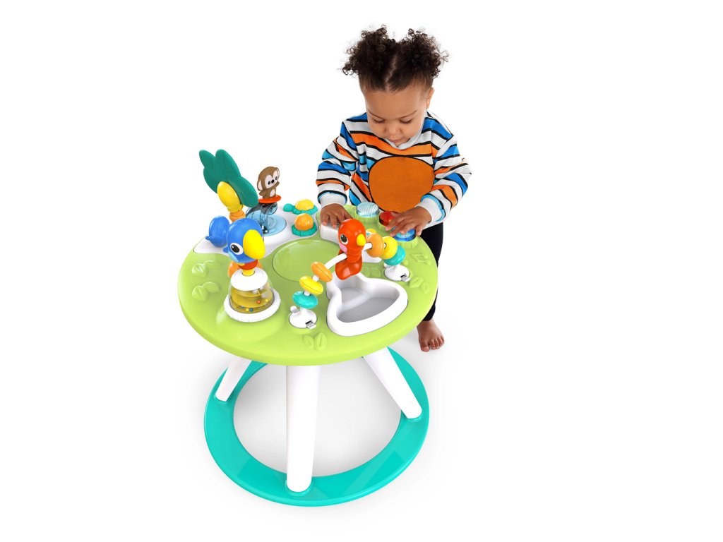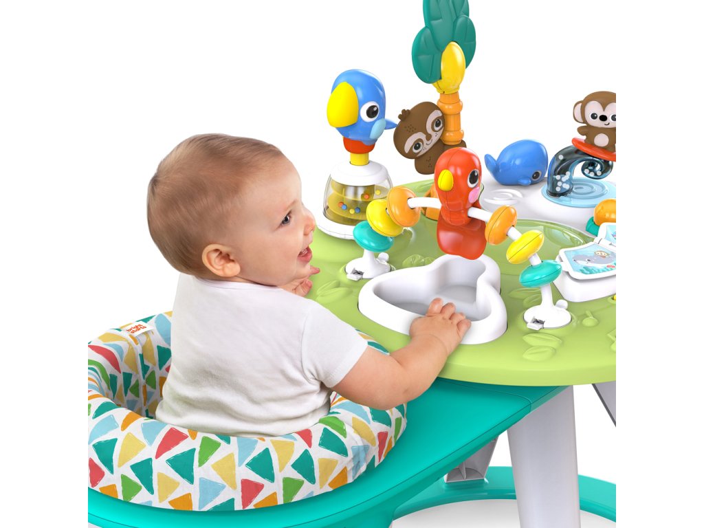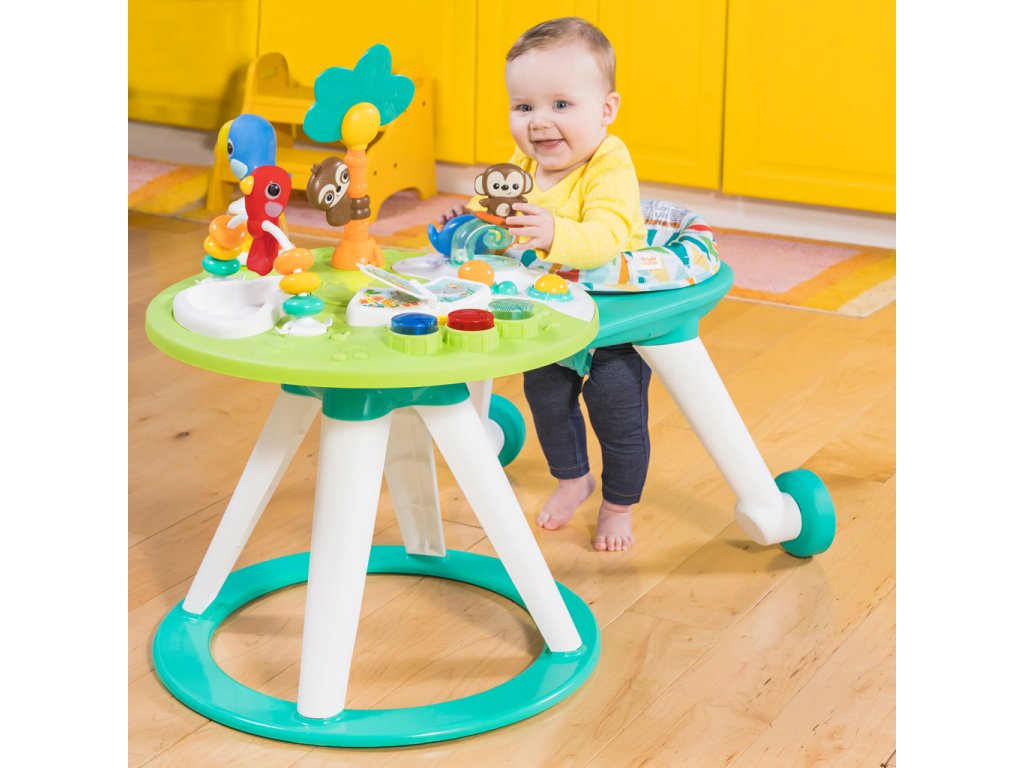 Aktívne centrum Around We Go 2v1 ponúka rôzne režimy hrania, podporuje viacero vývinových míľnikov vášho dieťatka a umožňuje hru viacerým deťom naraz! Hra s aktívnym centrom, ktoré obsahuje otočné sedadlo pre jednoduchý prístup ku všetkým hračkám zaujme dieťatko na dlhý čas, i keď bude na jednom mieste. Vaša rodina bude toto multifunkčné aktívne centrum využívať celé roky, vďaka jeho možnosti prispôsobovať sa potrebám dieťatka. Keď sa dieťa začne učiť stáť, odstráňte otočné sedadlo a premeňte hraciu stanicu na stolík pre batoľatá. Zábavu si môžu užiť aj súrodenci, či kamaráti! Aktívne centrum ponúka hru súčasne pre viac detí. Dizajn v tvare tropického ostrova je plný zábavy, ktorá pomáha deťom trénovať hrubú motoriku. Interaktívna súprava bubnov ponúka 2 režimy použitia – prepínajte medzi tiki melódiami a zvukmi zvierat, aby bola hra veselá. Obsahuje 10 aktivít: hudobné a svietiace bubny, točiace sa zvieratká, cvakajúca hračka, korálkový labyrint, surfujúca opička a ďalšie. Vlastnosti: - Ponúka dlhé využitie vďaka dizajnu 2v1: chodítko s otočným sedadlom alebo stojací stôl na aktivity - Odnímateľné chodítko s otočným sedadlom - Bubnová súprava sa rozsvieti pri hre a dotykoch - 10 tropických aktivít: bubny s režimom pesničiek a bubnovania, točiaci sa papagáj, korálkový labyrint, točiaci sa tukan, pohyblivá veľryba, surfujúca opička, cvakajúca korytnačka, točiaca sa opička a korytnačka - Hudba, svetlá a hračky zo všetkých strán upútajú a udržia pozornosť dieťaťa - Rastie spolu s dieťaťom od 6 mesiacov až do obdobia batoľaťa – naraz sa môžu hrať aj dve deti! - Detský stolík a hračky jednoducho udržíte v čistote - Poťah sedadla je možné prať v práčke - Zloženie materiálu: 95 % plast, 5 % polyester - Vekové rozpätie používateľa: 6 – 24 mesiacov - Rozmery po zložení (cm): 58,17 (výška) x 90,17 (šírka) x 59,18 (dĺžka) Dôležité: Pred odovzdaním výrobku dieťaťu odstráňte všetok obal a upevňovacie prvky. Tento obal a návod na použitie si uschovajte pre budúce použitie – obsahujú dôležité informácie. V rámci neustáleho procesu zlepšovania a inovácie naše výrobky priebežne aktualizujeme. Upozornenie: Táto hračka vytvára záblesky, ktoré môžu u citlivých osôb vyvolať epileptický záchvat. Adresa dodávateľa: KIDS2 EUROPE BV 5 Keizersgracht 287, 1016 ED Amsterdam, Netherlands; +31 20 241 0934.Dodatočné parametre