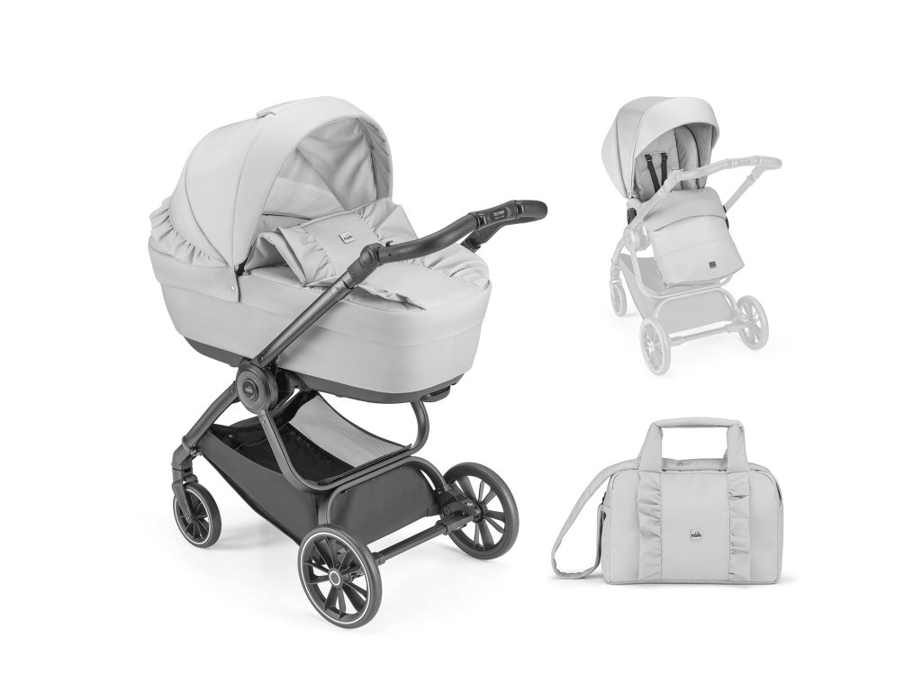 Hlboká prenosná postieľka, športová sedačka, podvozok, prebaľovacia taška, prebaľovacia podložka, nánožník, strieška a ramenné polstrovanie autosedačky.