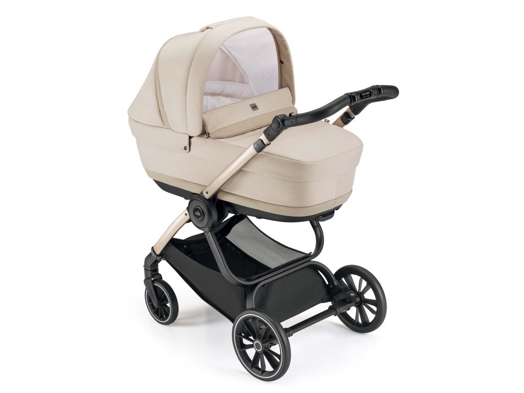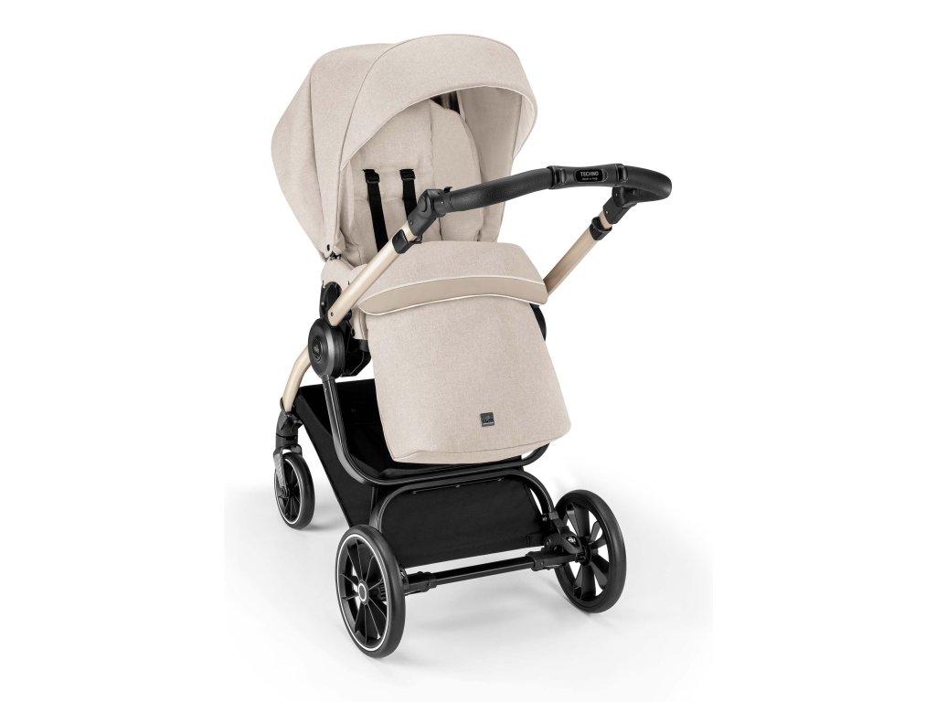 Podvozok Techno má odpruženú konštrukciu a praktické prídavné zariadenia, ktoré sa dajú ľahko nasadiť v oboch smeroch. O pohodlnú jazdu sa postarajú veľké zadné a predné kolesá s aretáciou. Navyše majú všetky ľahkú konštrukciu - sú vyrobené z materiálu EVA. Ich veľkou výhodou je, že sa nedajú prepichnúť. Takže sa na ne môžete stopercentne spoľahnúť, keď ste na cestách. Výškovo nastaviteľná rukoväť s ručným prešívaním z ekokože dopĺňa tento štýlový a praktický kočík. Počas jázd alebo výletov oceníte priestranný nákupný košík, do ktorého môžete umiestniť potraviny alebo všetky potrebné veci. Podvozok kočíka sa navyše ľahko skladá. V zloženom stave je veľmi kompaktný, samostatne stojí a vďaka hmotnosti len 7 kg sa s ním ľahko manipuluje.