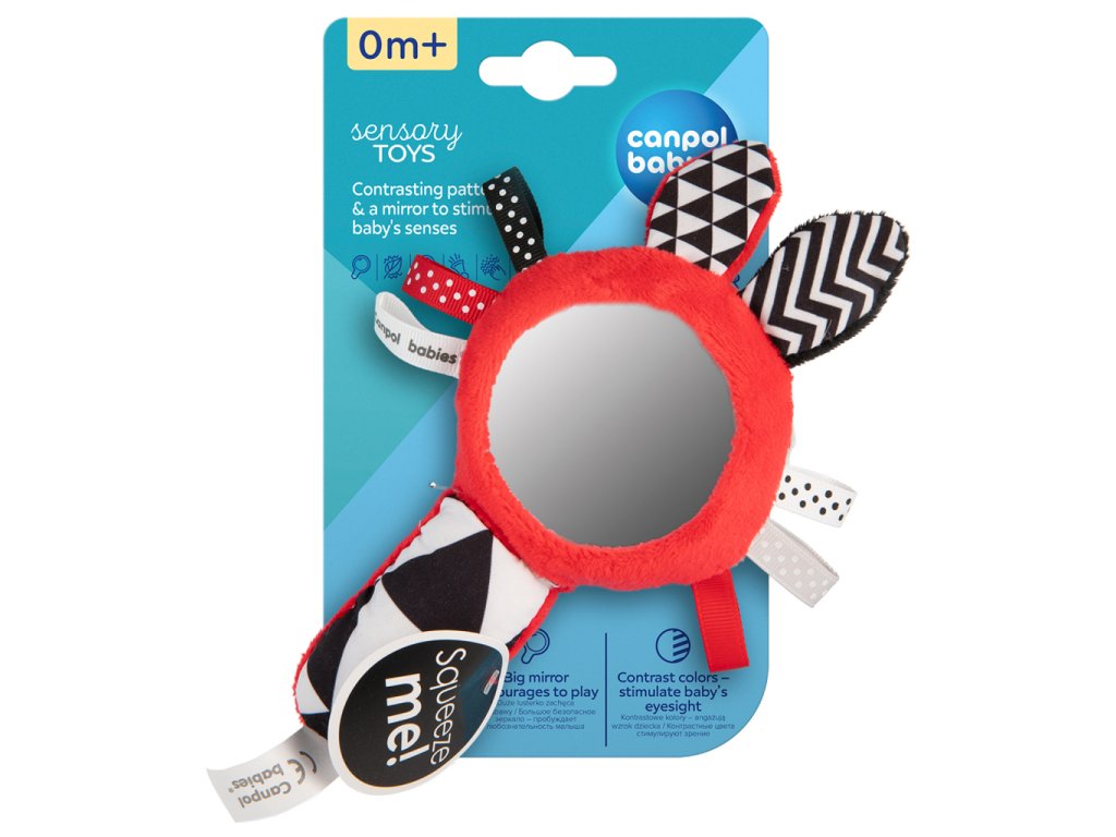 Kontrastná pískacia činka so zrkadielkom SENSORY. Vďaka praktickému tvaru je možné hračku jednoducho uchopiť. Činka disponuje pískacími elementmi, zrkadlom a látkovými stužkami. Senzorické farby stimulujú rozvoj zmyslov dieťaťa. O kolekcii SENSORY: Senzorická kolekcia hračiek bola vyvinutá pre deti do jedného roku. Počas tohto obdobia dochádza k najvýznamnejším zmenám v psychomotorickom vývoji dieťaťa. Senzorické hračky sú reakciou na aktuálny trend na trhu, ktorý sa zameriava na podporu rozvoja prostredníctvom zábavy, keď rodič spolu s dieťaťom môže stimulovať rozvoj zraku, precvičovať schopnosť sústrediť pozornosť na objekt, zameriavať a nasledovať objekty očami alebo precvičovať obratnosť a koordináciu. Prečo sú senzorické hračky také dôležité? Zrak dieťaťa je po narodení najmenej rozvinutým zmyslom. Tma, ktorá prevláda v maternici, nedovoľuje, aby sa zrak v prenatálnom období plne rozvinul. Po narodení je zrak dieťaťa rozmazaný a hmlistý. Dieťa vidí iba obrysy v rozmedzí 20-30 cm, veľké tvary a prvky z prostredia. Asi po mesiaci začne vidieť farby, spočiatku červené a čierne. Asi za tri mesiace si začne všímať ďalšie výrazné farby. Približne vo veku šiestich mesiacov začína vidieť detaily na obrázkoch a tiež vidí oveľa jasnejšie. V dvanástom mesiaci života je už zrak dieťaťa plne vyvinutý ako u dospelého a stáva sa skvelým nástrojom na objavovanie sveta. Senzorické hračky z novej kolekcie SENSORY tak pomáhajú stimulovať zrak dieťaťa a trénujú schopnosť sústrediť pozornosť už od prvých týždňov života. Adresa výrobcu: Canpol Sp. z o.o. 02-884 Warszawa, ul. Puławska 430, Polska Słubica B, ul. Graniczna 4, 96-321 Żabia Wola, Poland tel. (+48 46) 858 00 00 fax: (+48 46) 858 00 01 babies@canpolbabies.com www.canpolbabies.comDodatočné parametre