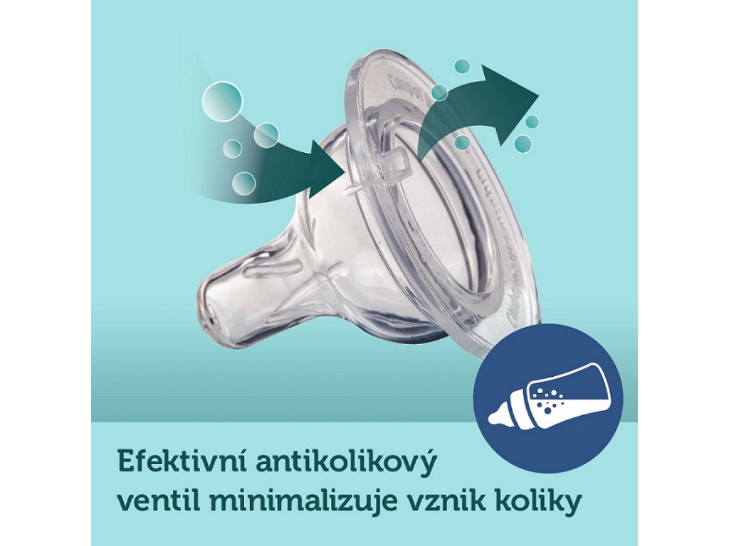 Antikolikový ventil – zabraňuje tvorbe bublín v mlieku, minimalizuje riziko koliky, prehĺtania vzduchu a nadúvania.