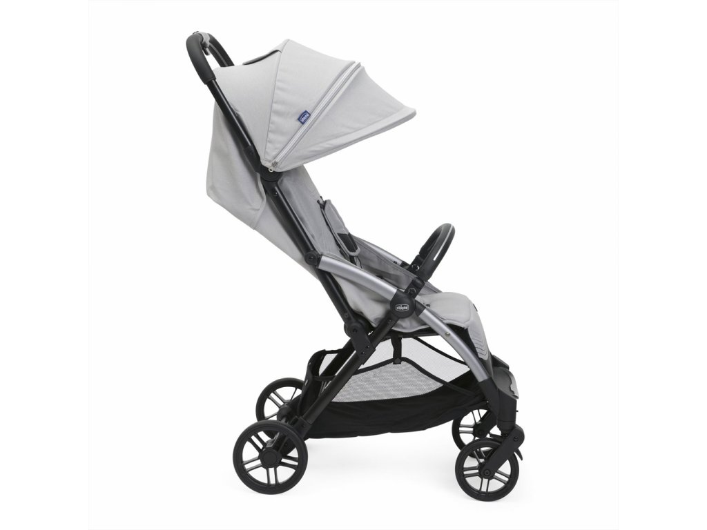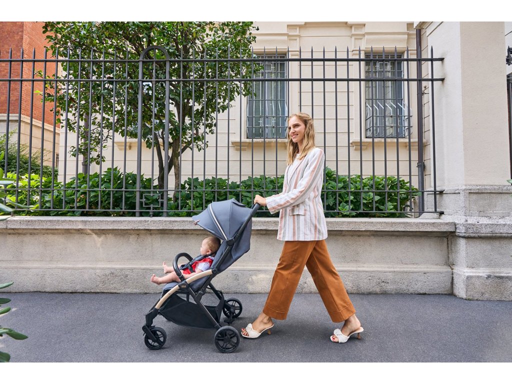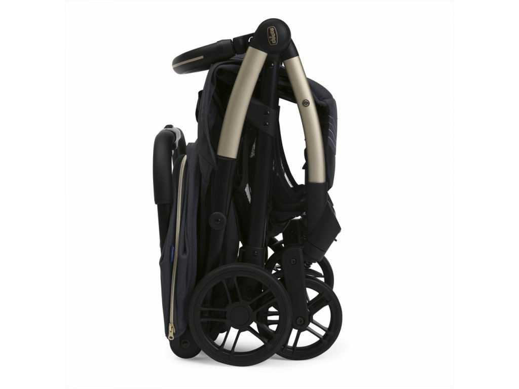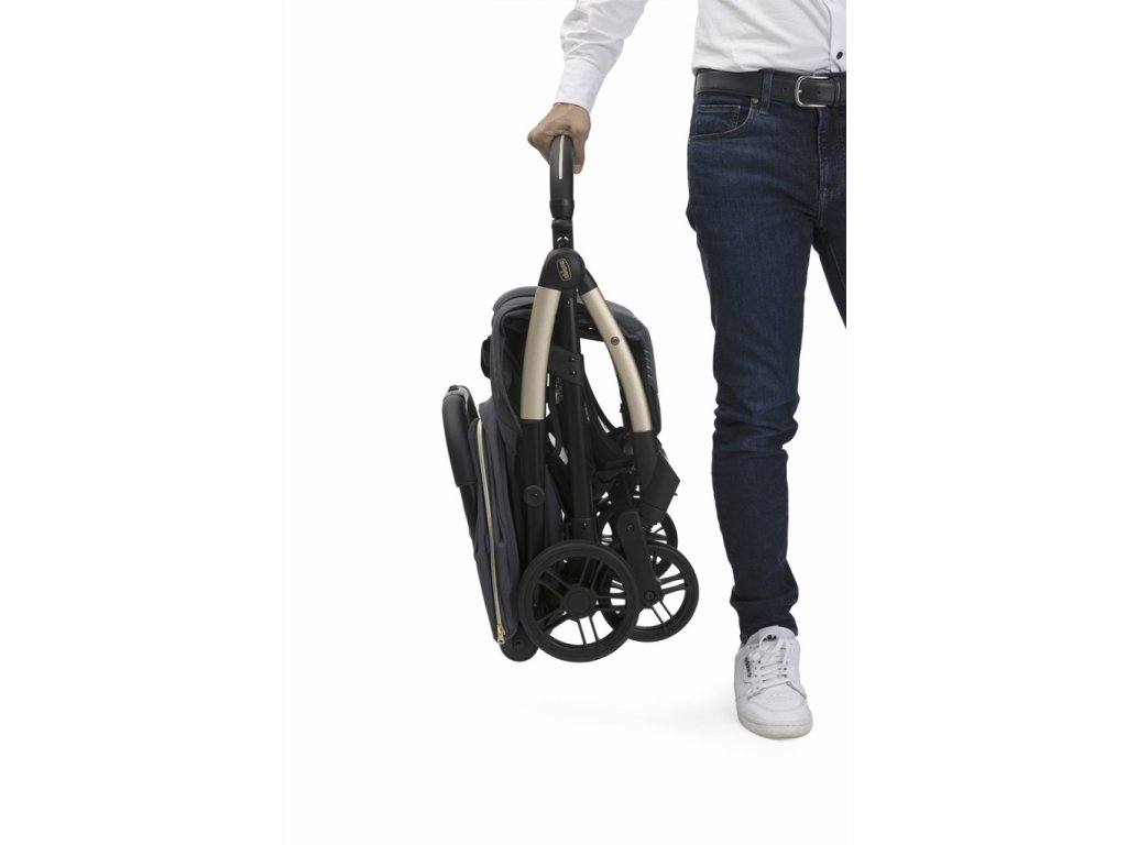 Stačí jeden dotyk a kočík sa sám zloží! Po zložení je skutočne kompaktný a stojí samostatne. Madlo sa dá tiež poskladať pre dosiahnutie väčšej kompaktnosti alebo môže byť použité ako rukoväť na prenášanie.