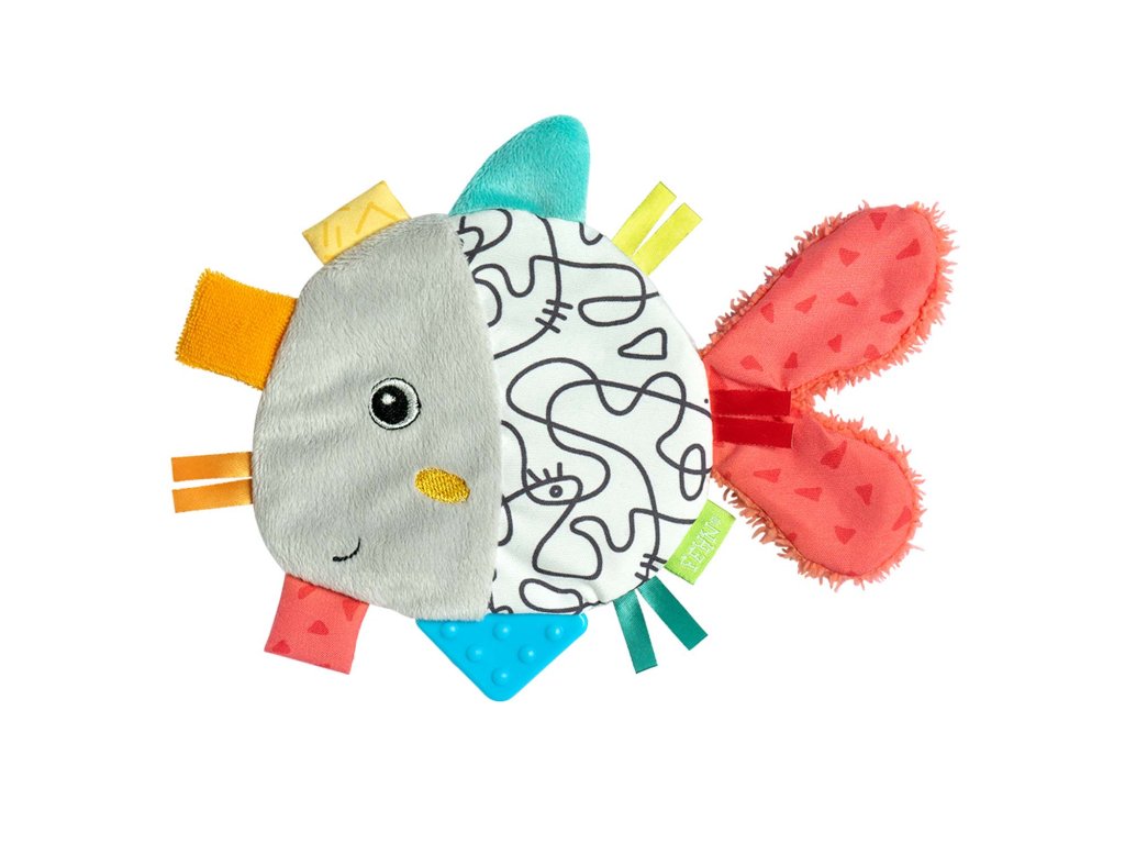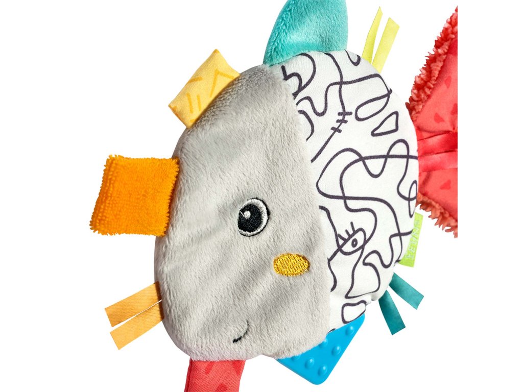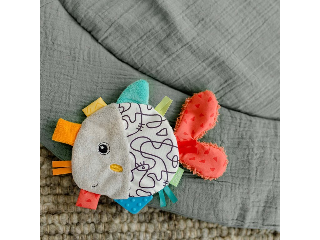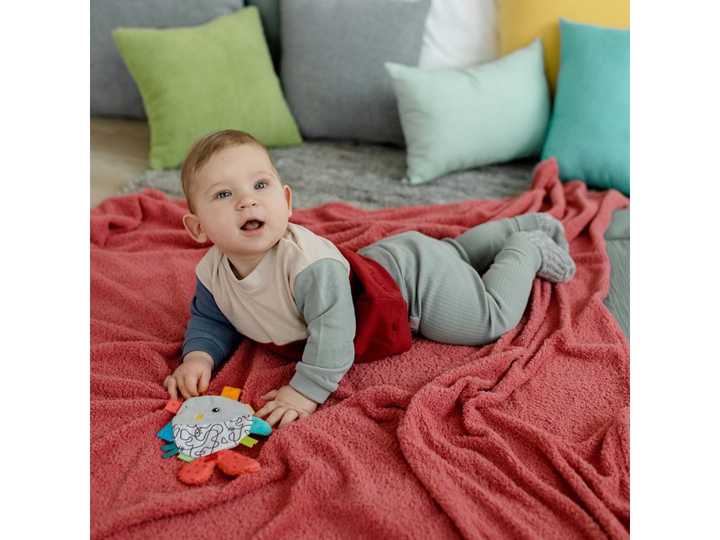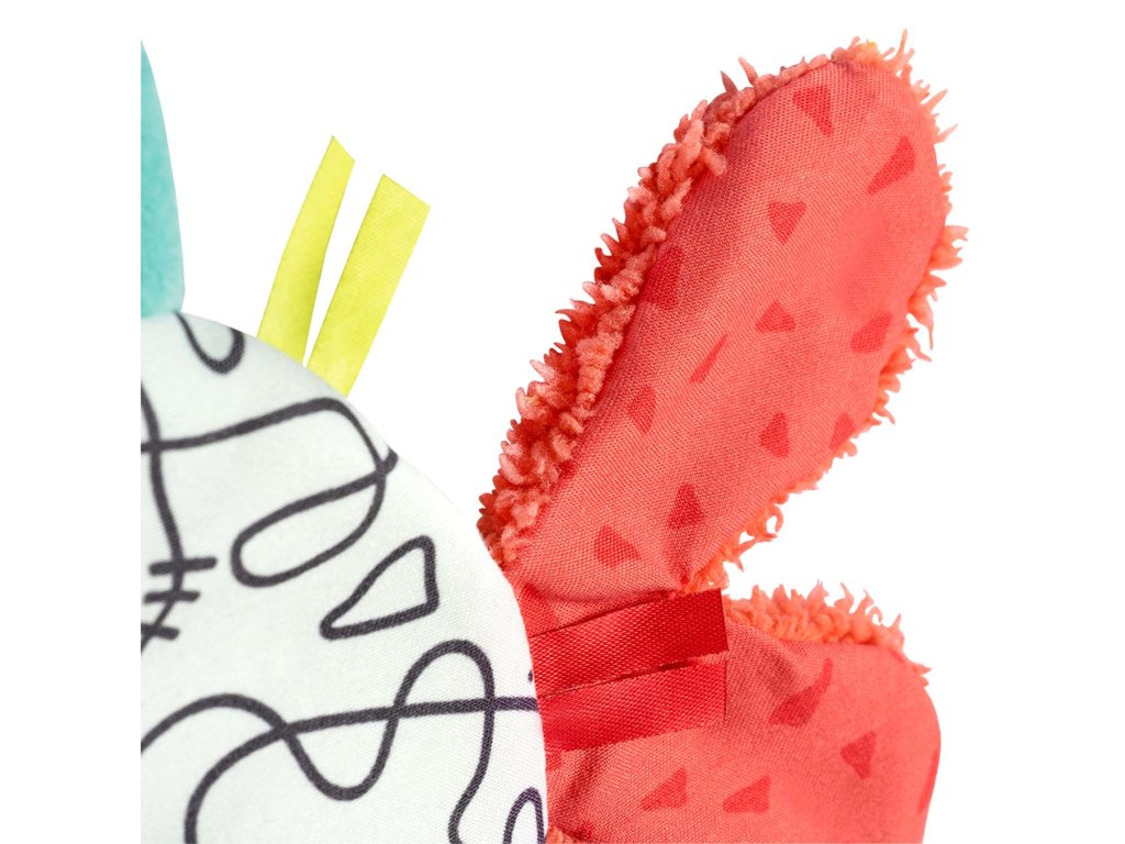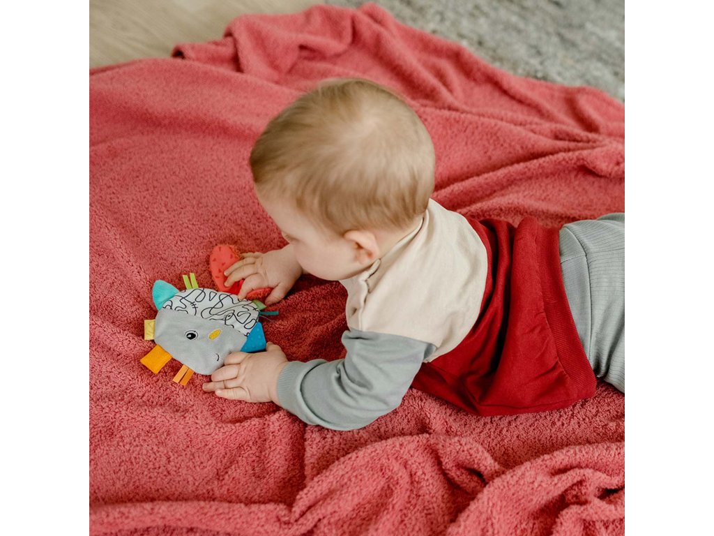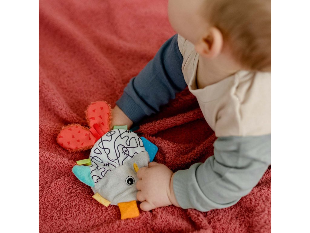 Plyšová hrkálka s množstvom aktivity prvkov ako je šuštiaci papier, hryzátko, mix materiálov. Hračka na uchopenie hravo podporuje sluch dieťaťa, zmysel pre zrak, hmat, zdravé uchopenie – ideálny ako darček pre chlapcov a dievčatá k narodeniu, narodeninám či krstu.