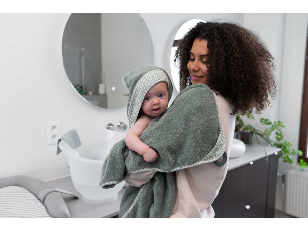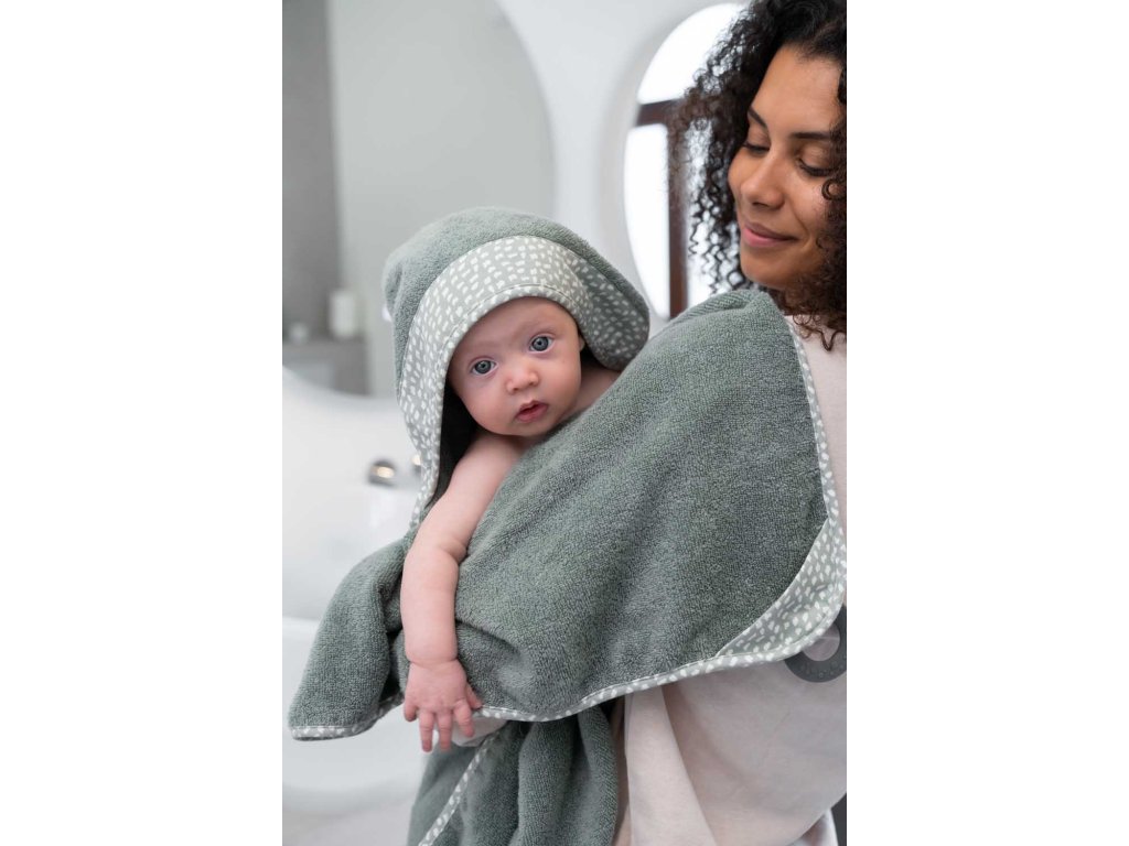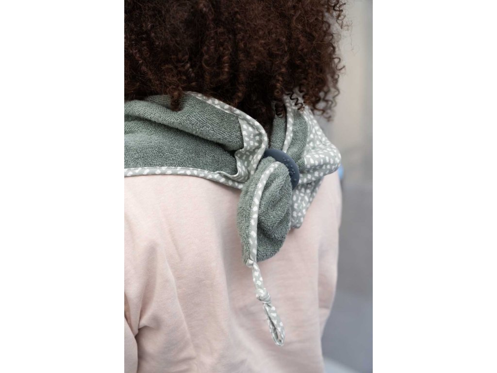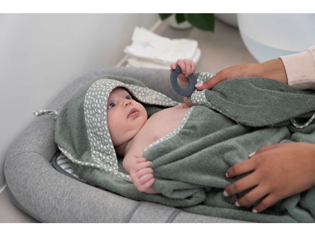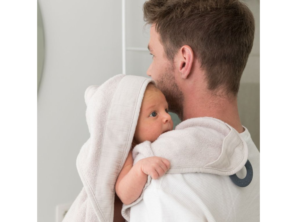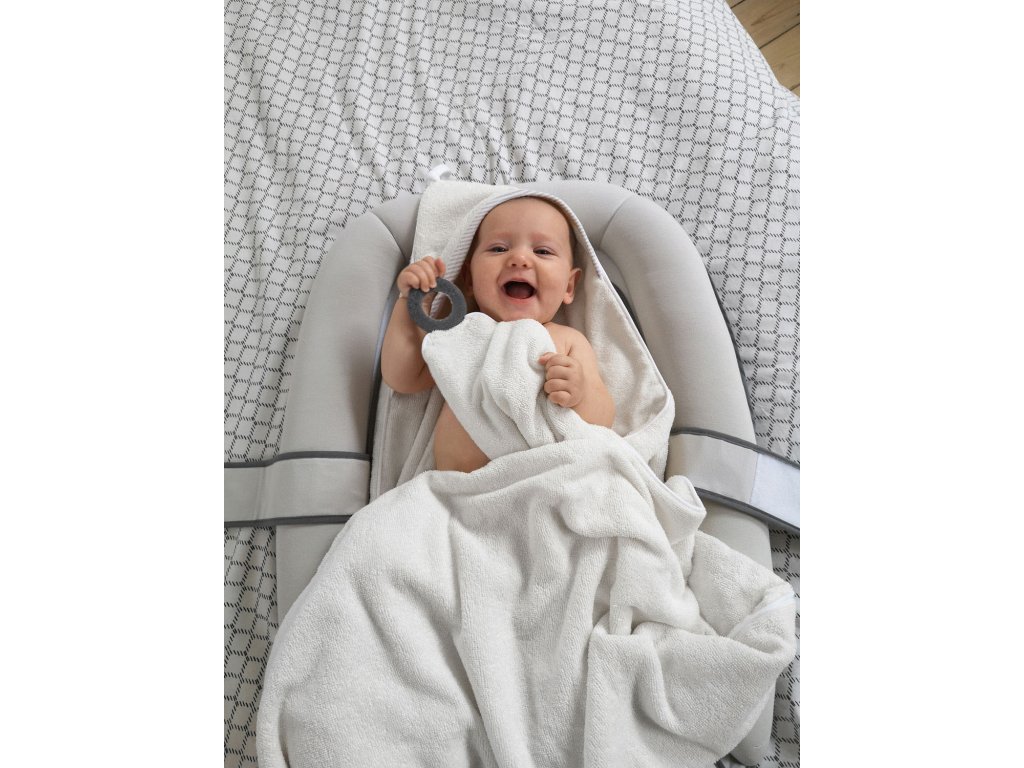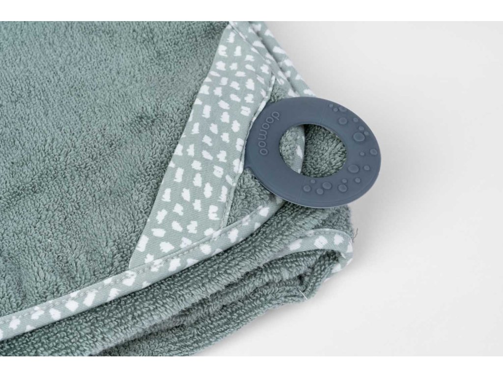 Hebučký uterák s kapucňou Doomoo Dry&Play nie je len tak obyčajný uterák. Vďaka vychytávke v podobe silikónového kolieska, si ho rodičia ľahko pripevnia okolo krku na svoje telo, získajú tak voľné ruky na pohodlné a bezpečné umývanie dieťatka, a navyše sú chránení pred cákanci. Po kúpeli, dieťatko vo svojom náručí pohodlne zabalí do uteráka a silikónové koliesko poslúži ako hryzátko.
