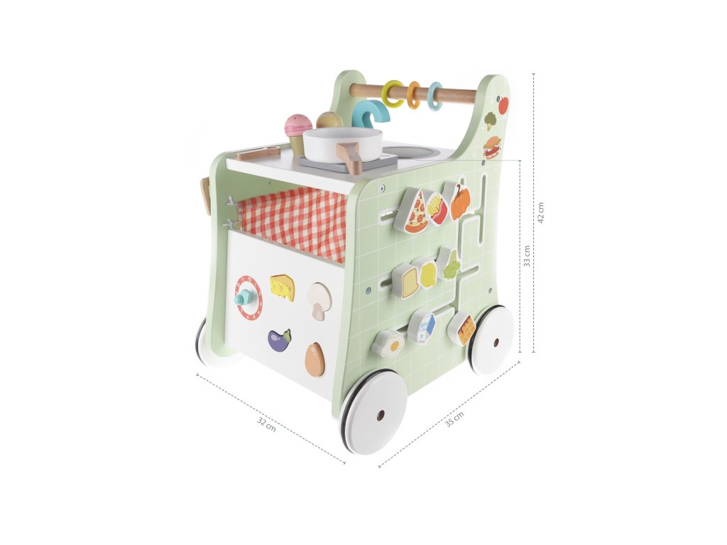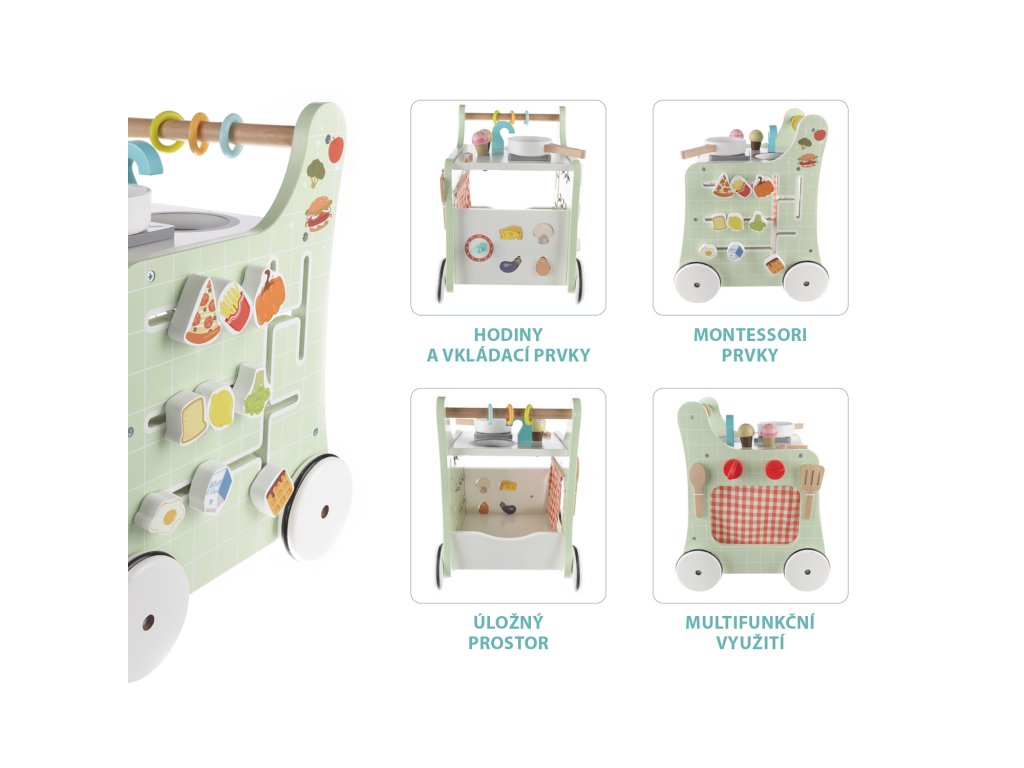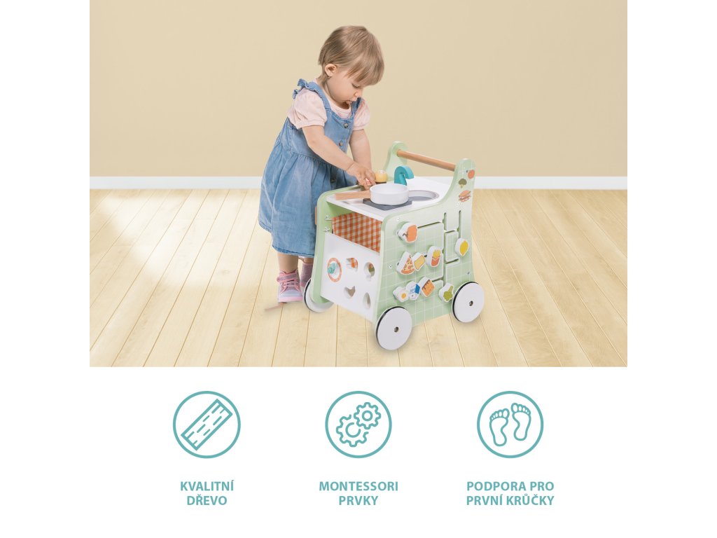 drevená rukoväť, ktorej sa dieťa môže držať. Štyri tiché kolieska potom pomáhajú
