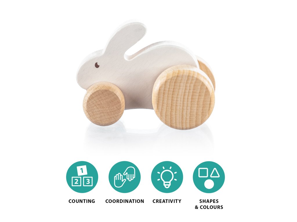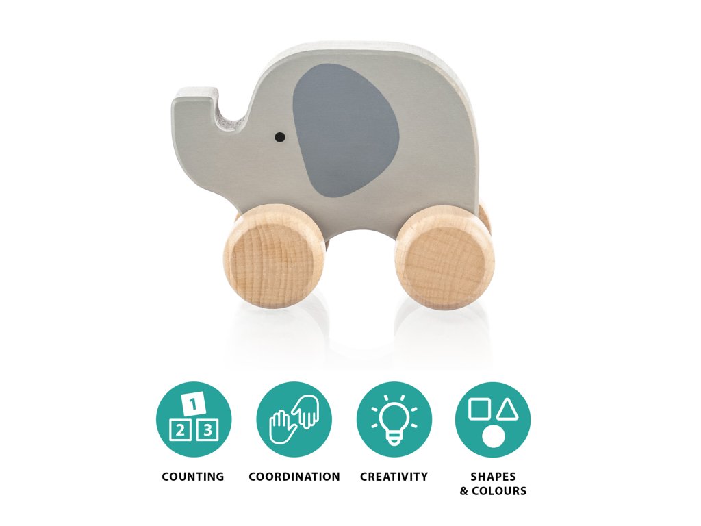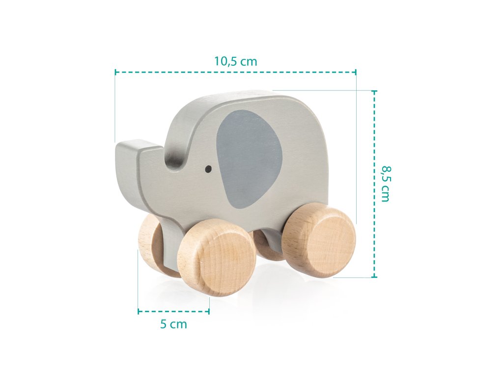 Ľahký a kompaktný jazdiaci slon je ideálnou hračkou do malých detských rúk. Je vyrobený z kvalitného prírodného dreva a natretý farbami na vodnej báze. Veľké, odolné kolesá si hravo poradia s kobercom, drevenou podlahou aj terénom ihriska.