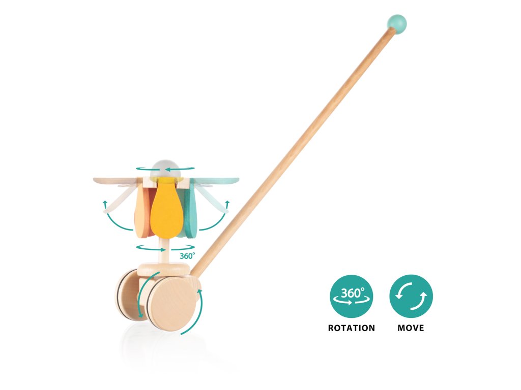 Jazdec na tyči je ideálna hračka pre deti, ktoré začínajú chodiť. Zábavná kvetina na dlhej tyči sa pri pohybe otáča, pričom sa zároveň rozvíja a zahaľuje. Výsledkom je, že dieťa sa častejšie prechádza a zabaví sa na celé hodiny. Okrem toho slúži robustná tyč ako opora pri prvých krôčikoch dieťaťa a na konci je vybavená drevenou guľou pre väčšiu bezpečnosť. Posuvník nemá ostré hrany a je vyrobený z odolného dreva s dlhou životnosťou.