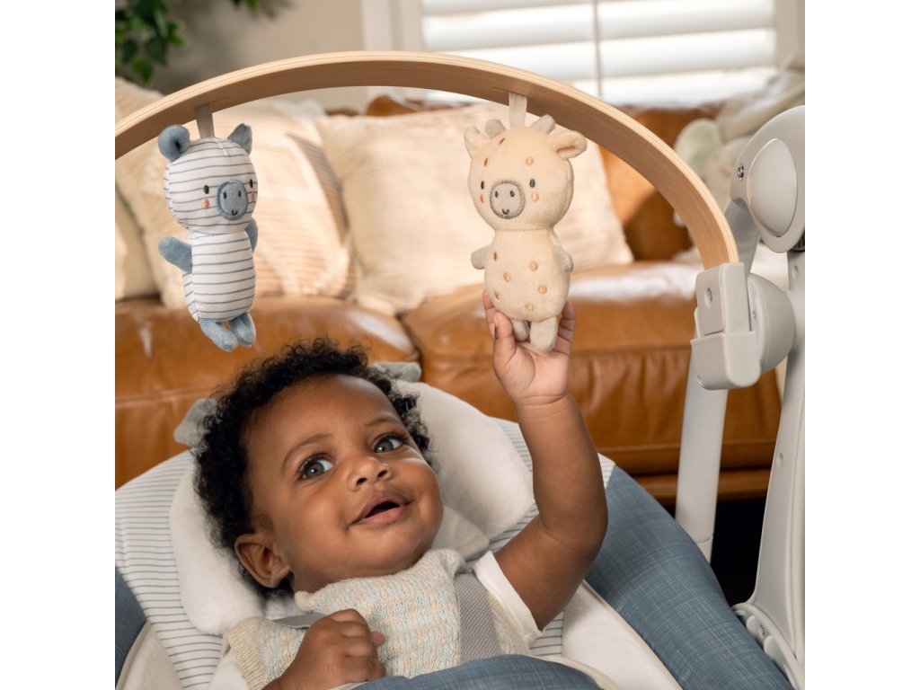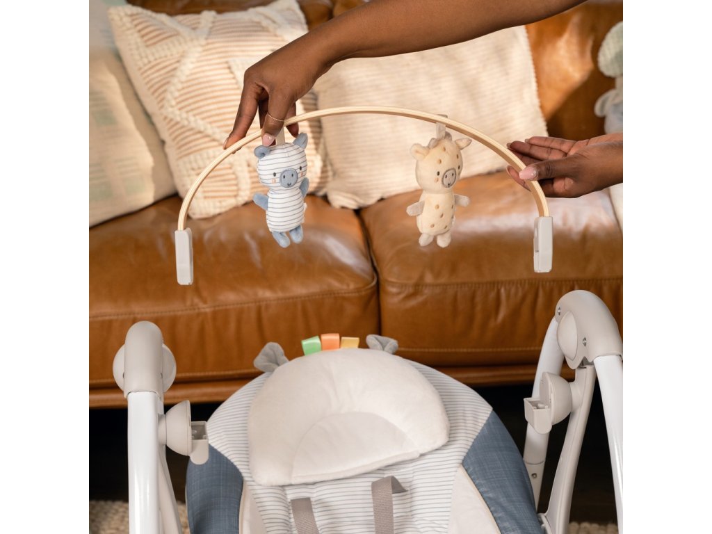 Zabavte bábätko a zároveň pridajte šmrnc svojej elegantnej výzdobe s prenosnou hojdačkou Ingenuity Swing 'n Go - Chambray! Odnímateľná a otočná hrazdička – vyrobená z dreva z trvalo udržateľného lesa – dodáva nádych luxusných detailov. Hrazdička je odnímateľná a otočná pre ľahké umiestnenie dieťaťa do hojdačky a von z nej. Táto vysokovýkonná hojdačka ponúka 5 rýchlostí s technológiou TrueSpeed snímania hmotnosti s časovačom a hojdacím motorom WhisperQuiet. Hojdačka je napájaná USB káblom (je súčasťou balenia). Pohodlie bábätka je kľúčové, preto sme nastaviteľnú opierku hlavy a sedaciu časť vyrobili z mäkkého boa a ďalších plyšových materiálov. Sedák a opierka hlavy sú odnímateľné pre rýchle a pohodlné čistenie. Dve obľúbené postavičky Ingenuity, žirafa Rafi a zebra Casi poskytujú farebné podnety na hru. Hračky sú tiež odnímateľné pre zábavu na cestách. Udržujte dieťa v kontakte s darom hudby, pretože táto hojdačka je vybavená 8 melódiami a 3 jemnými prírodnými zvukmi s funkciou ovládania hlasitosti pre pohodlie rodičov. Dizajn hojdačky SlimFold je skladateľný pre jednoduché skladovanie. Swing 'n Go je vybavený 5-bodovými bezpečnostnými pásmi, ktoré udržia dieťa v bezpečí. Táto prenosná hojdačka je určená pre deti od 0 do 9 mesiacov alebo do 9kg, podľa toho, čo nastane skôr. Prenosná hojdačka Ingenuity Swing 'n Go - Chambray predstavuje úžasný darček pre štýlového rodiča (a dieťa)! Rozmery (V x Š x D): 58,42 x 55,88 x 59,69 cm Hmotnosť: 5,04 kg UPOZORNENIE: Tento výrobok nepoužívajte, ak vaše dieťa dokáže sedieť bez pomoci alebo váži viac ako 9 kg. Adresa dodávateľa: KIDS2 EUROPE BV 5 Keizersgracht 287, 1016 ED Amsterdam, Netherlands; +31 20 241 0934Dodatočné parametre