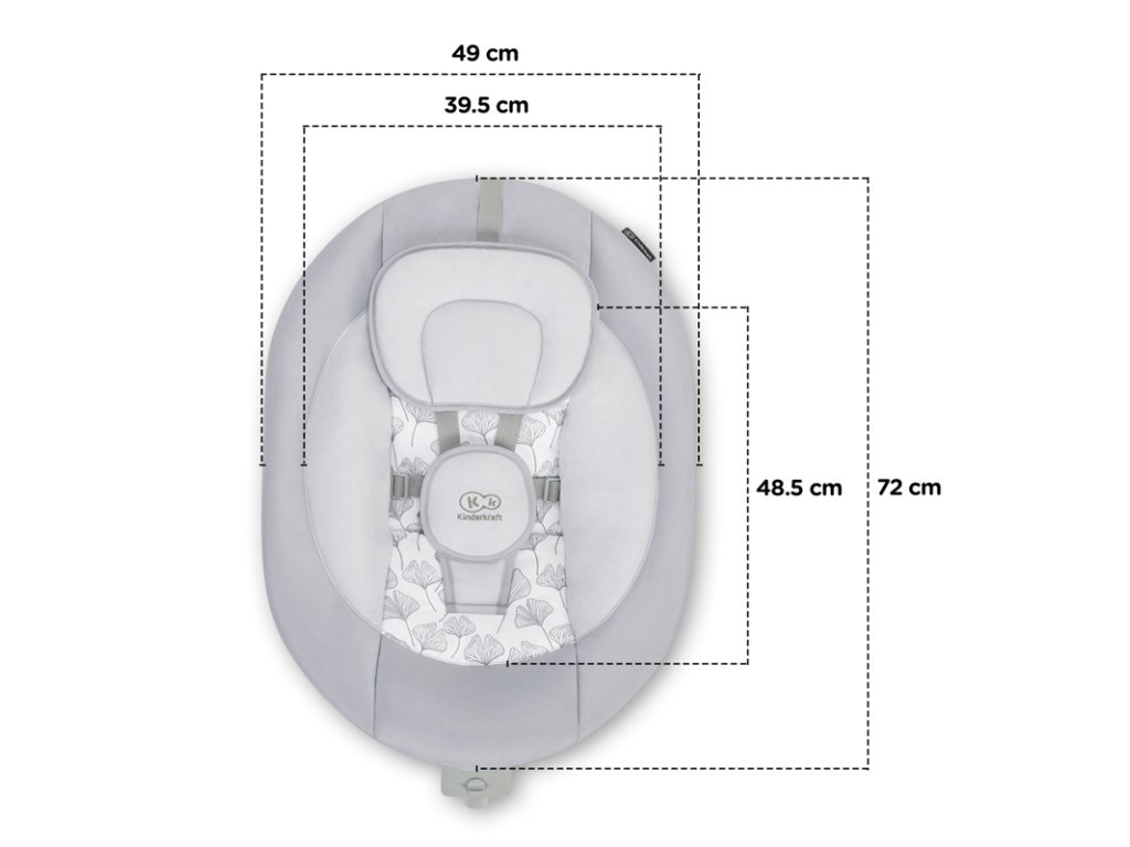Lehátko ponúka až 5 rýchlostí kolísania, časovač (8, 15 alebo 30 minút), tichý motorček a 12 melódií s nastavením hlasitosti. Bezpečnosť dieťaťa zaisťujú nastaviteľné 5-bodové pásy a stabilná konštrukcia s možnosťou zafixovania do pevnej polohy. Súčasťou je mäkký nastaviteľný vankúš a odnímateľná hrazdička s dvomi plyšovými hračkami.