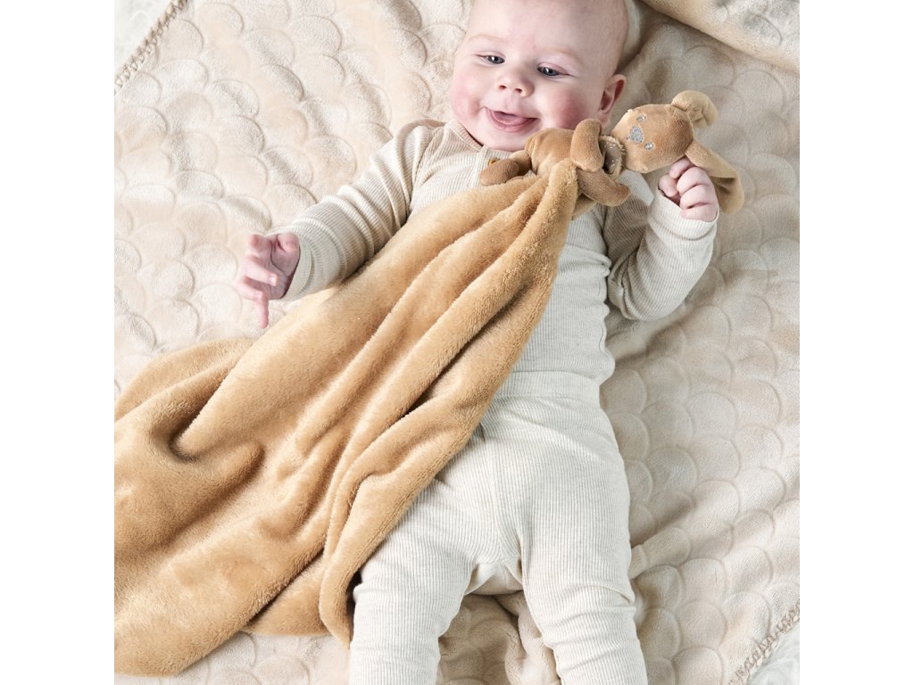Je vyrobená z mimoriadne hebkého a príjemného materiálu, ktorý poskytuje dieťatku pohodlie a pocit bezpečia – či už doma, v postieľke, v kočíku alebo počas cestovania.