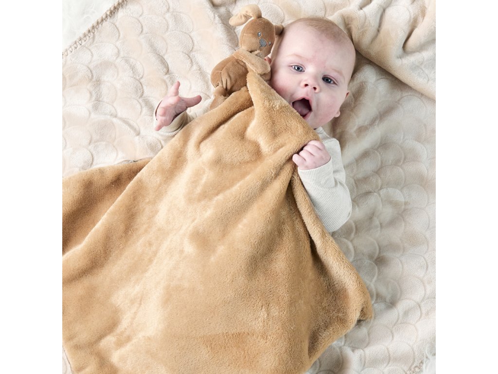Súčasťou deky je mini plyšový zajačik, ktorého môžu malé rúčky ľahko uchopiť a maznaním rozvíjať jemnú motoriku. Praktická šnúrka na upevnenie cumlíka zaisťuje, že sa obľúbený cumlík nikdy nestratí.