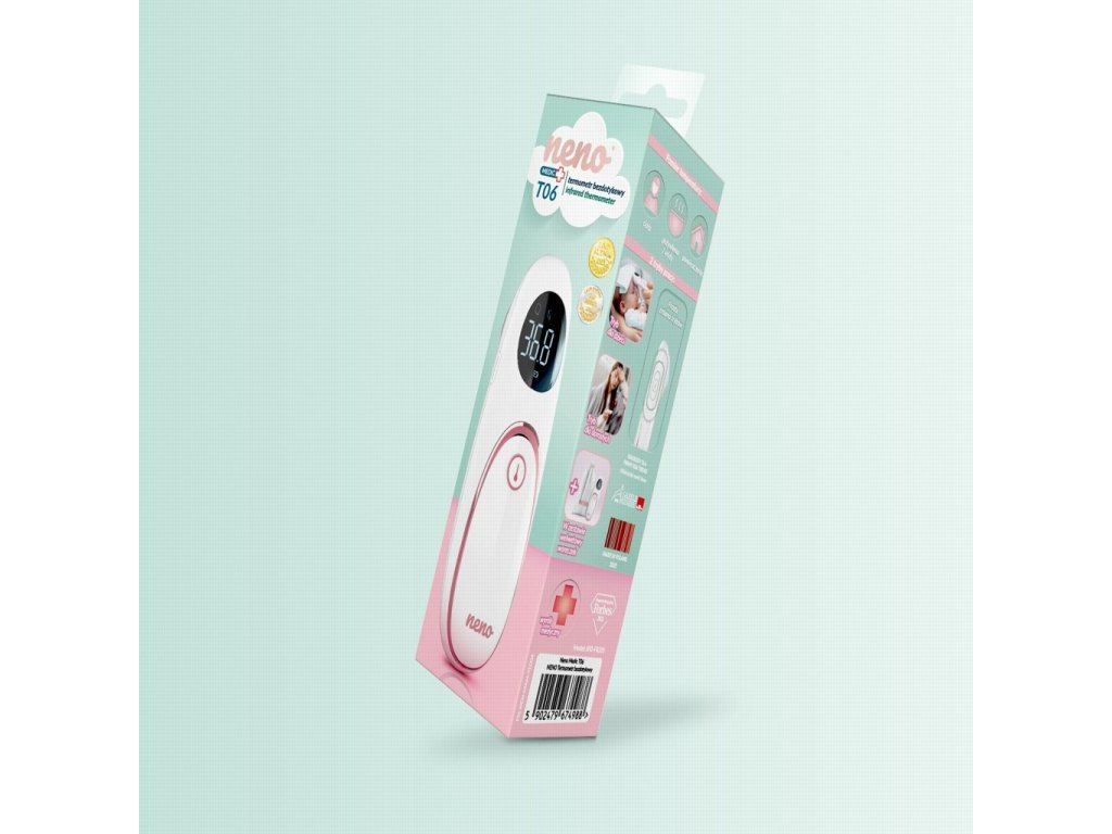 Spoľahlivý pomocník pre každého rodiča! Neno Medic T06 poskytuje presné meranie teploty už za pár sekúnd – rýchlo, bez kontaktu a s maximálnym ohľadom na pohodlie dieťaťa. S režimami pre deti aj dospelých môžete mať istotu, že každé meranie bude presné a prispôsobené veku používateľa. Meranie prebieha pohodlne z čela, bez stresu a bez dotyku – ideálne aj pre najmenšie deti. Skvelý tip na darček – je ideálnym doplnkom do každej rodiny s deťmi. Vlastnosti: - Dva režimy merania – pre deti do 12 rokov a pre dospelých - Presné bezkontaktné meranie – pomocou infračervenej technológie - Tichý režim – ideálny na meranie teploty aj počas spánku dieťaťa - Pamäť na 20 meraní – sledujte priebeh teploty počas choroby - Meranie teploty objektov – vhodné na kontrolu teploty jedla, kúpeľa či miestnosti - Magnetický kryt batérie – jednoduchá a rýchla výmena batérií - Jednoduché prepínanie medzi °C a °F - Sonda správnej vzdialenosti – kontrola optimálnej vzdialenosti merania - Praktické puzdro v balení – ideálne na cesty či návštevy lekára - Prehľadný displej – jasné zobrazenie výsledku vo dne aj v noci - Minimalistický dizajn – moderný a ergonomický vzhľad Obsah balenia: - Teplomer Neno Medic T06 - 2× AAA batérie - Praktické puzdro - Používateľský manuál Technické parametre: - Miesto merania: čelo, miestnosť, jedlo, objekt - Jednotky: °C / °F - Pamäť: 20 meraní - Meracia vzdialenosť: < 5 cm - Presnosť: čelo ±0,2 °C (36–39 °C), objekt ±1 °C - Rozsah teploty: čelo 22–43 °C / objekt 0–100 °C - Batérie: 2× AAA (súčasť balenia) - Automatické vypnutie: po 10 sekundách Rozmery produktu: 4,8 x 5 x 17 cm Dôležité: Pred použitím si prosím pozorne prečítajte pokyny. Výrobok nevkladajte do vody. Výrobok nevkladajte do parného sterilizátora na dezinfekciu. Ak je výrobok poškodený, nerozoberajte ho sami. Obráťte sa na autorizovaný servis. Výrobok nie je hračka. Adresa výrobcu: KGK Trend sp. z o.o., ul. Ujastek 5b, 31–752 Kraków, Poland. info@kgktrend.pl, NIP 678 315 51 46Dodatočné parametre