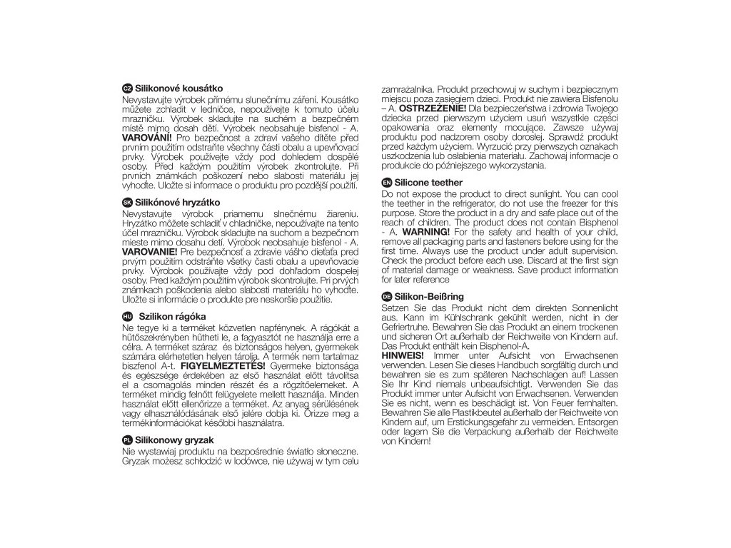 Silikónové hryzátko ELEFI Mäkké silikónové hryzátko pozostávajúce z krúžku s 3 zaujímavými prvkami je vyrobené výhradne z potravinárskeho silikónu bez obsahu BPA. Najkvalitnejšie odolné materiály zaručujú bezpečnosť vášho dieťatka počas hry a prerezávania zúbkov. Pružný silikón je dokonale vhodný pre citlivé detské ďasienka. Pomáha zmierniť bolesť, ktorá vzniká pri prerezávaní zúbkov, pretože pri hryzení hryzátka sa jemne masírujú ďasná. Hryzátko možno schladiť v chladničke a dať dieťatku studené. Rôzne povrchy hryzátka stimulujú správny vývoj čeľuste. Primeraná veľkosť hryzátka umožňuje dieťatku ľahké uchopenie a vynikajúcu, bezpečnú hru, ktorá stimuluje jeho vývoj. Vlastnosti: - mäkké, ľahké a pružné - vyrobené zo 100 % bezpečného potravinárskeho silikónu bez obsahu BPA - má upokojujúci účinok na ďasná dieťatka počas prerezávania zúbkov - ergonomický dizajn, tvarovaný s ohľadom na najmenších: malé rozmery uľahčujú uchopenie a hranie - rôznorodý povrch na stimuláciu dobrého vývoja čeľuste - bezpečný tvar, zabraňujúci uduseniu - rozvíja motorické schopnosti dieťaťa - možno chladiť v chladničke (nie v mrazničke) - ľahko sa udržiava v čistote, možno ho umývať v umývačke riadu - rozmery: hryzátko v tvare slona 7 x 6 cm, veľký okraj 8,5 cm, malý okraj 6 cm - hmotnosť: 55 g Adresa dodávateľa: ags 92, s.r.o., Drahobejlova 2515/18, 190 00 Praha, Česká republika info@petiteetmars.com UPOZORNENIE! Pre bezpečnosť a zdravie vášho dieťaťa pred prvým použitím odstráňte všetky časti obalu a upevňovacie prvky. Výrobok používajte vždy pod dohľadom dospelej osoby. Pred každým použitím výrobok skontrolujte. Pri prvých známkach poškodenia alebo slabosti materiálu ho vyhoďte. Uložte si informácie o produkte pre neskoršie použitie.Dodatočné parametre