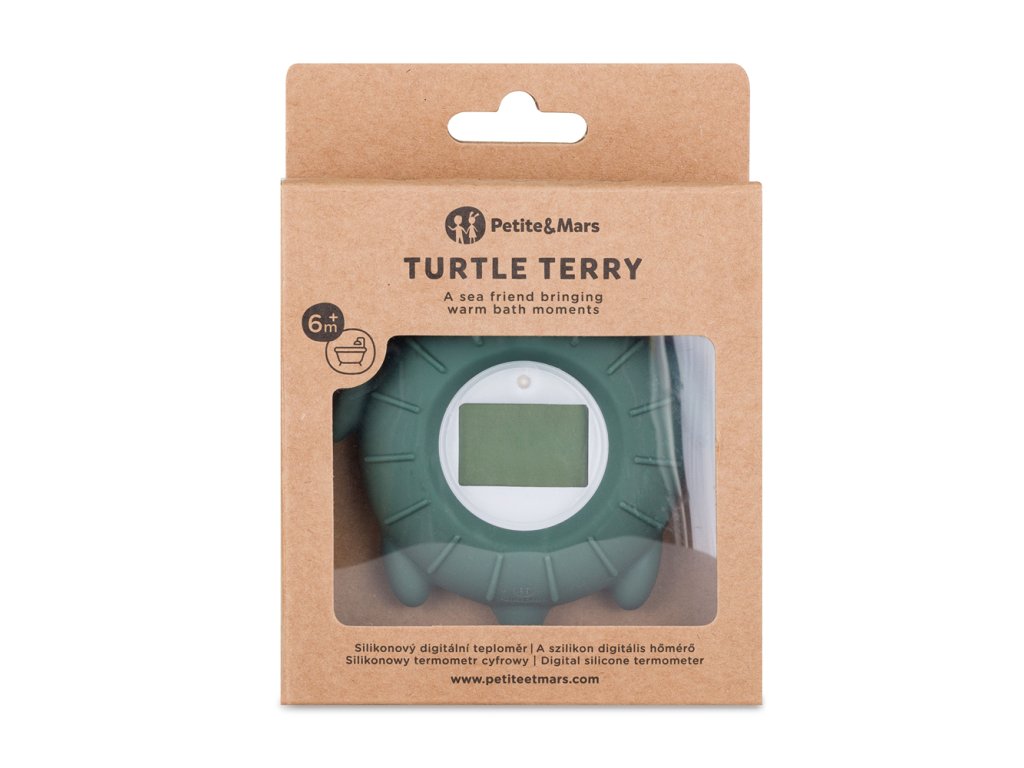 PETITE&MARS Teplomer silikónový digitálny do vody Turtle Terry Misty Green 0m+