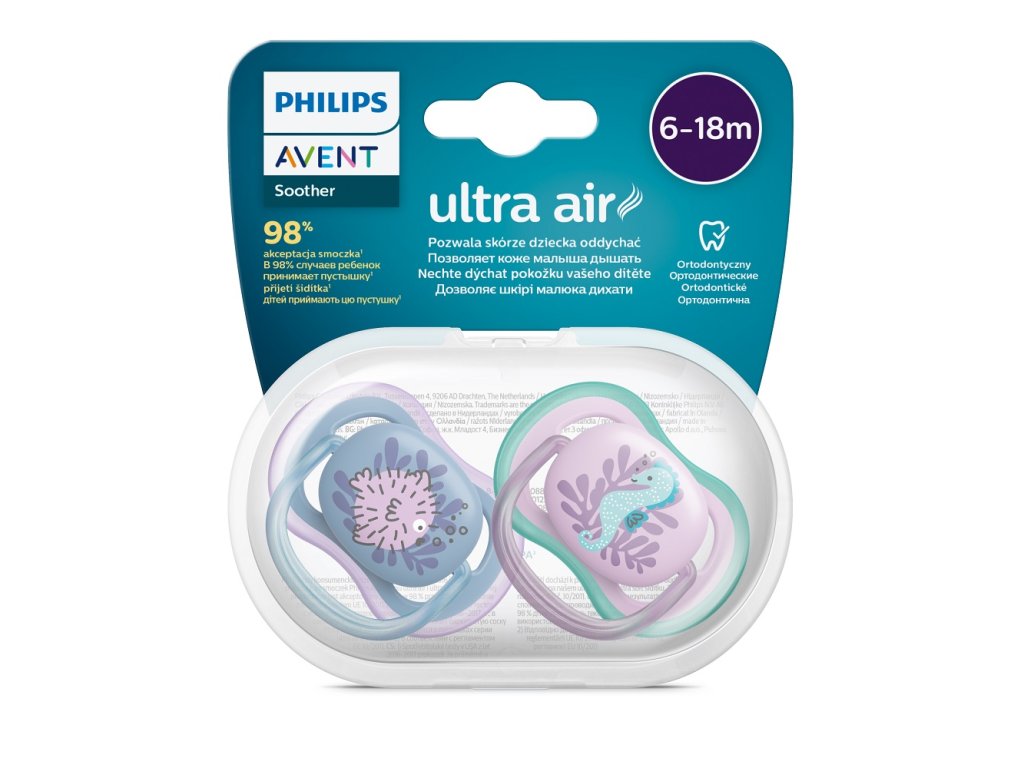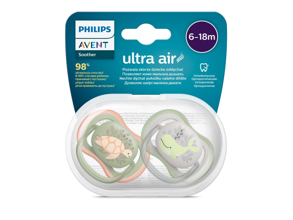 Umožnite pokožke vášho dieťatka dýchať. Mimoriadne veľké otvory na vzduch na pohodlnejšie utíšenie. Utišuje vďaka dostatku vzduchu. Cumlík Philips Avent ultra air má mimoriadne veľké otvory na vzduch, ktoré udržia pokožku vášho dieťatka suchú. K dispozícii v rôznych farbách a vzoroch. Vlastnosti: - Sterilizujte a odkladajte v jednom praktickom puzdre - Pohodlná sterilizácia do 3 minút - Cumľanie spríjemnené vzduchom - Nechajte pokožku dieťaťa dýchať - Pohodlný a hodvábne mäkký cumlík - Prirodzený pre dieťa - 98 % prijatie cumlíka* - Cumlík je vyrobený zo 100 % silikónu potravinárskej kvality - Prirodzený vývoj ústnej dutiny - Zaručená kvalita - Navrhnuté a vyrobené v Holandsku Nechajte pokožku dieťaťa dýchať Mimoriadne veľké prieduchy umožňujú pokožke vášho dieťaťa dýchať, takže zostane počas cmúľania suchšia. 98 % prijatie cumlíka* Keď sme sa spýtali rodičov, ako ich dieťatká reagujú na naše textúrované silikónové cumlíky, v priemere 98 % z nich sa vyjadrilo, že ich dieťa cumlíky Philips Avent ultra soft a ultra air prijíma. Cumlík je vyrobený zo 100 % silikónu Pre naše cumlíky ultra soft a ultra air sme zámerne vybrali silikónový materiál, pretože je to bezpečný a inertný materiál, bežne používaný v zdravotníckych aplikáciách, bez obsahu nebezpečných chemikálií, endokrinných aktívnych látok (napr. BPA) a alergénov. Ortodontický cumlík Naše ortodontické, symetrické a mäkké silikónové cumlíky sú navrhnuté tak, aby zaistili prirodzený vývin ústneho podnebia. Prirodzený pre dieťa Náš textúrovaný silikónový cumlík je navrhnutý tak, aby pripomínal prsník mamičiek. Sterilizujte do 3 minút Cestovné puzdro, ktoré sa dodáva s našimi cumlíkmi ultra soft a ultra air, slúži zároveň ako sterilizátor. Stačí len naliať vodu a vložiť do mikrovlnnej rúry. S istotou tak budete vedieť, že cumlík je čistý a pripravený na použitie. Vyrobené v Holandsku Naše cumlíky ultra soft a ultra air sú navrhnuté a vyrobené v Holandsku. Upozornenie: Sterilizátor / obal na prenášanie, voda a cumlíky môžu byť po 5 minútach chladnutia stále ešte veľmi horúce. Varovanie týkajúce sa sterilizačného obalu: Pred použitím vždy skontrolujte teplotu cumlíkov. Nesprávna výška hladiny vody, výkon mikrovlnnej rúry alebo dĺžka jej použitia môžu viesť k nižšej sterilizácii a môžu poškodiť sterilizátor / obal na prenášanie alebo cumlíky. Používajte iba cumlíky Philips Avent a obal uschovávajte mimo dosahu detí. Cumlík • Pre bezpečnosť vášho dieťaťa • VÝSTRAHA! Pred každým použitím dôkladne skontrolujte. Natiahnite cumlík do všetkých smerov. V prípade akýchkoľvek známok poškodenia alebo opotrebenia ho vyhoďte. Nevkladajte cumlík do vody a následne do mrazničky. Mohlo by dôjsť k oslabeniu cumlíka. Používajte iba držiaky cumlíkov, ktoré boli testované v súlade s normou EN 12586. K cumlíku nepripevňujte žiadne ďalšie pútka ani šnúrky, dieťa by sa nimi mohlo uškrtiť. Cumlík nepriväzujte dieťaťu okolo krku; hrozí nebezpečenstvo uškrtenia. Vždy sa uistite, že vaše dieťa používa správnu veľkosť cumlíka. Cumlíky Philips Avent sa vyrábajú v rôznych veľkostiach podľa vekového rozmedzia. Pred prvým použitím: Cumlík dajte na 5 minút do vriacej vody. Nechajte ho 5 minút vychladnúť, skôr ako ho dáte svojmu dieťaťu. Nechajte vodu zachytenú vnútri cumlíka vychladnúť a potom ju vytlačte von. Tým zaistite potrebnú hygienu. Čistenie a sterilizácia: Pred každým použitím cumlík umyje teplou vodou a jemným mydlom. Na čistenie cumlíka NEPOUŽIVAJTE abrazívne čističe ani agresívne chemikálie/prípravky. Nadmerná kombinácia čistiacich prípravkov môže spôsobiť popraskanie plastových častí. V takom prípade cumlík ihneď vymeňte. Cumlíky sú vhodné pre všetky bežne používané metódy sterilizácie. Skôr ako sa dotknete sterilizovaných cumlíkov, dôkladne očistite povrchy aj svoje ruky. Používanie: Používajte tento výrobok vždy pod dohľadom dospelej osoby. Z bezpečnostných a hygienických dôvodov cumlík po štyroch týždňoch používania vymeňte. NEPANIKÁRTE, ak nie je možné cumlík vybrať z úst. Nie je možného prehltnúť, je navrhnutý tak, aby bolo možné zvládnuť aj tieto situácie. Opatrne a čo najjemnejšieho vyberte z úst. Neponárajte cumlík do sladkých látok alebo liekov, u dieťaťa by mohlo dôjsť ku vzniku zubného kazu. Skladovanie: Cumlík uschovávajte v sterilizátore / obale na prenášanie alebo v suchej krytej nádobe. Nenechávajte cumlík na priamom slnku alebo blízko zdroja tepla, ani ho nenechávajte v sterilizačnom roztoku dlhšie, ako sa odporúča, pretože by mohlo dôjsť k jeho porušeniu. Adresa dodávateľa: Philips Consumer Lifestyle B.V., Tussendiepen 4, 9206 AD Drachten, The Netherlands, PH.CentralRegulatoryOfficer@philips.comDodatočné parametre