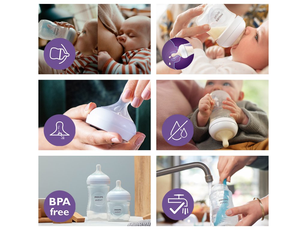 Fľaša Natural Response podporuje rytmus pitia dieťaťa, rovnako ako prsník. - Sklenená fľaša 240 ml, 1m+ - Nový cumlík pre dojčenské fľaše Natural Response umožňuje dieťaťu sať, prehĺtať a dýchať, ako pri pití z prsníka. - Jednoduchá kombinácia dojčenia a kŕmenia z fľaše. - Antikolikový ventil . - Dizajn v tvare prsníka bez kvapkania. Podporuje prirodzený rytmus pitia dieťaťa Cumlík Natural Response uvoľňuje mlieko len vtedy, keď dieťa aktívne pije. To umožňuje dieťaťu piť, prehĺtať a dýchať v prirodzenom rytme, ako na prsníku. Vďaka tomu môžete ľahko kombinovať dojčenie a kŕmenie z fľaše. Jednoduchá kombinácia dojčenia a kŕmenia z fľaše - Prirodzené prisatie vďaka cumlíku v tvare prsníka - Cumlík uvoľňuje mlieko, keď dieťa aktívne pije Ďalšie výhody - Vyberte si cumlík so správnym prietokom pre vaše dieťa - Dizajn cumlíka zabraňuje kvapkaniu, vylievaniu a plytvaniu mlieka - Kompatibilný s radom výrobkov Philips Avent - Ľahko uchopiteľné pre malé ruky - Jednoduché používanie, čistenie a rýchle zloženie - Cumlíky a fľaše Natural Response neobsahujú BPA - Buďte trpezliví a nechajte dieťa, aby si zvyklo - Vzduch nepreniká do bruška dieťaťa vďaka ventilu - Navrhnuté na zníženie rizika koliky a nepohodlia Cumlík Natural Response Cumlík Natural Response funguje v harmónii s prirodzeným rytmom kŕmenia dieťaťa, takže môžete ľahko kombinovať dojčenie a kŕmenie z fľaše. Cumlík má jedinečný otvor, ktorý uvoľňuje mlieko len vtedy, keď dieťa aktívne pije. Takže, keď si dieťa urobí prestávku na prehltnutie a nadýchnutie, pozastaví sa aj tok mlieka. Prirodzené prisatie Široký, mäkký a pružný cumlík je navrhnutý tak, aby napodobnil tvar a pocit z prsníka a pomohol dieťaťu pohodlne sa prisať a kŕmiť. Antikolikový ventil Antikolikový ventil je navrhnutý tak, aby počas kŕmenia udržiaval vzduch mimo bruška vášho bábätka, a tým pomáhal zmierniť koliku a nepohodlie. Cumlík bez kvapkania Otvor na cumlíku je určený na uvoľnenie mlieka len pri kŕmení dieťaťa. Takto môžete zabrániť rozliatiu mlieka, či už doma, alebo na cestách. Ľahko sa používa a čistí Široké hrdlo fľaše zabezpečuje jednoduché plnenie a umývanie. Fľaša má len pár dielov, takže sa dá rýchlo a ľahko zložiť. Jednoduché držanie Ergonomická fľaša sa ľahko uchopí v akomkoľvek uhle a poskytuje maximálne pohodlie počas kŕmenia. Jednoduchá na držanie pre vás aj malé ručičky dieťaťa. Kompatibilný so širokou škálou výrobkov Skombinujte našu odsávačku mlieka, fľaše a hrnčeky a vytvorte si výrobok podľa svojich aktuálnych potrieb. Bez obsahu BPA Fľaše Philips Avent Natural sú vyrobené vyrobené z materiálu bez obsahu BPA. Nájdite správny prietok cumlíka Každé dieťa sa kŕmi inak a vyvíja sa vlastným spôsobom. vlastným tempom. Navrhli sme rôzne rýchlosti prietoku, aby ste mohli nájsť ten správny pre vaše dieťa a mohli ste si fľašu tak prispôsobiť. Všetky Cumlíky Natural Response sú vyrobené vyrobené z mäkkého silikónu. UPOZORNENIE! - Nepretržité a dlhodobé sanie tekutín spôsobuje zubný kaz. - Vždy skontrolujte teplotu potravy pred podaním. - Pri prvom náznaku poškodenia či opotrebovania produkt odhoďte. - Počas nepouživania udržujte komponenty mimo dosah detí. - Nikdy nespájajte so šnúrami, stužkami, šnúrkami, alebo s voľnými časťami odevu, mohlo by dôjsť k uškrteniu dieťaťa. - Nikdy nepoužívajte cumlík na kŕmenie ako bežný cumlík. - Sklené fľaše sa môžu rozbiť. - Používajte tento výrobok výlučne pod dohľadom dospelých. Neodporúča sa používať mikrovlnnú rúru na zohrievanie detského jedla a nápojov. Mikrovlnné žiarenie môže zničiť cenné výživné látky v jedle alebo nápojoch. Okrem toho môže spôsobovať nerovnomerné ohriatie. Ak sa rozhodnete použiť mikrovlnnú rúru, buďte mimoriadne opatrní a zohriate jedlo alebo nápoje vždy zamiešajte, aby ste zabezpečili rovnomernú teplotu, a pred podávaním teplotu ešte skontrolujte. Do mikrovlnnej rúry vložte len nádobu bez krúžku so závitom, cumlíka a viečka. Nedovoľte deťom, aby sa hrali s malými dielmi ani aby pri používaní fliaš chodili alebo behali. Na konci kŕmenia vždy vylejte všetko zvyšné materské mlieko. Pred každým použitím skontrolujte a potiahnite cumlík na kŕmenie všetkými smermi. Pri prvom náznaku poškodenia či opotrebovania produkt odhoďte. Na rozmiešanie obsahu alebo vyčistenie sklenenej fľaše nepoužívajte kovové predmety. Môže to poškodiť sklo. Ak sú na fľaši praskliny alebo sa vo fľaši nachádzajú úlomky skla, nepoužívajte ju. Nepoužívajte rukoväte v kombinácii so sklenými fľašami. Dlhodobé opotrebovanie alebo poškriabanie môže spôsobiť rozbitie. Adresa dodávateľa: Philips Consumer Lifestyle B.V., Tussendiepen 4, 9206 AD Drachten, The Netherlands, PH.CentralRegulatoryOfficer@philips.comDodatočné parametre