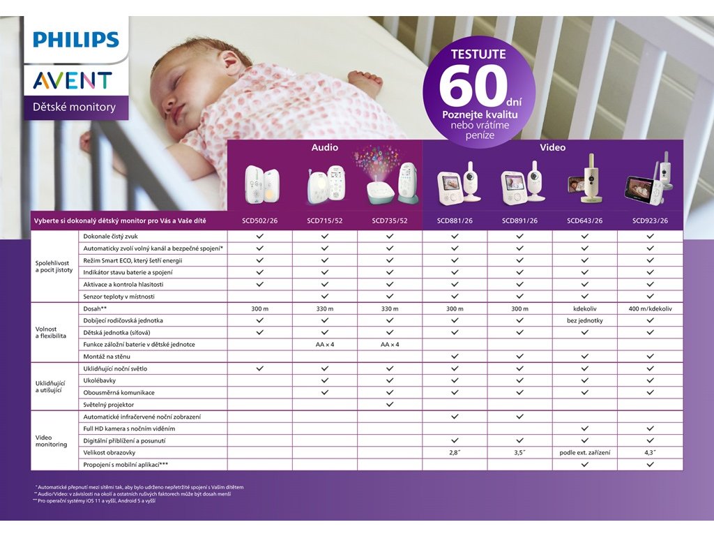 S novým radom monitorov DECT Philips AVENT môžete v kľude odpočívať s vedomím, že je vaše dieťa spokojné, aj keď s ním nie ste v miestnosti. - snímače teploty - digitálny displej - možnosť komunikácie s dieťaťom Nový rad monitorov DECT poskytuje množstvo neoceniteľných vlastností. Digitálne technológie vás upozornia aj na najtichší šepot a umožnia vám upokojiť vaše dieťa vďaka spojeniu s garanciou nulového rušenia v dome a v jeho okolí. Funkcie: - 100% spoľahlivé spojenie s dieťaťom - Kontrolky LED indikujú, či je jednotka pripojená a či je v dosahu - Kontrolky aktivované zvukom indikujú, či bábätko vydáva nejaké zvuky - Nabíjacia rodičovská jednotka s dobou prevádzky až 24 hodín Čo je na tomto monitore zaujímavého? - Režim Smart ECO zaisťuje efektívne využívanie energie - Snímač teploty s nastaviteľnými výstrahami - Príjemné nočné svetlo a uspávanky upokoja vaše ratolesti - Obojsmerná komunikácia - bábätko vás môže počuť - Dosah vo voľnom priestore až 330 m - o 33 % dlhšia výdrž batérie ako Philips Avent SCD711/SCD713 Získajte výhodu 60 dňovej garancie vrátenia peňazí Zistiť viac informácií tu: www.philips.sk/mbg-avent Nebezpečenstvo -Zariadenie na monitorovanie dieťaťa nesmiete ponárať do vody ani inej tekutiny. Neumiestňujte zariadenie na miesto, kde hrozí, že naň môže kvapkať alebo sa vyliať voda. Zariadenie na monitorovanie dieťaťa nikdy neukladajte na vlhké miesta ani do blízkosti vody. -Nikdy nepoložte žiaden predmet na vrchnú časť zariadenia na monitorovanie dieťaťa, ani ho neprikrývajte. Neblokujte vetracie otvory. Inštalujte podľa inštrukcií výrobcu. Varovanie -Dlhý kábel. Riziko uškrtenia! -Pred zapojením zariadenia do siete skontrolujte, či napätie uvedené na adaptéri zodpovedá napätiu v sieti. -Používajte len adaptér dodaný spolu so zariadením. -Model: S005Bxy0600050 -Parametre: Vstup: 100 – 240 V~, 50/60 Hz, 0,15 A Výstup: 6,0 V 0,5 A, 3 W -xy=NV(zástrčka v EÚ) alebo xy=NB (zástrčka v Spojenom kráľovstve) -Priemerná účinnosť v aktívnom režime: 74,38 % -Spotreba energie bez záťaže (W): 0,1 W LEVEL VI -Neupravujte ani neodstrihujte žiadnu časť adaptéra ani jeho kábla. Predstavuje to nebezpečnú situáciu. -Ak je poškodený adaptér, nechajte ho vymeniť za niektorý z originálnych typov, aby ste predišli nebezpečným situáciám. -Toto zariadenie môžu používať deti od 8 rokov a osoby, ktoré majú obmedzené telesné, zmyslové alebo mentálne schopnosti alebo nemajú dostatok skúseností a znalostí, pokiaľ sú pod dozorom alebo im bolo vysvetlené bezpečné používanie tohto zariadenia a za predpokladu, že rozumejú príslušným rizikám. Deti sa nesmú hrať s týmto zariadením. Deti bez dozoru nesmú čistiť ani vykonávať údržbu tohto zariadenia. -Dbajte na to, aby na sieťový kábel nikto nestúpil ani ho nezalomil, najmä pri zástrčkách a v mieste, kde vychádza zo spotrebiča. -Uistite sa, že elektronického strážcu detí ste umiestnili takým spôsobom, aby jeho kábel nebol prekážkou otvoru dverí ani chodby. Ak umiestnite elektronického strážcu detí na stôl alebo nízku skrinku, nenechajte sieťový kábel prevísať cez okraj stola alebo skrine. Niekto by oň mohol zakopnúť. Uistite sa, že kábel neleží na zemi, kde predstavuje nebezpečenstvo potknutia sa. -Baliace materiály (plastové vrecká, kartónová škatuľa a pod.) odkladajte mimo dosahu detí. Nie sú to hračky. -Aby nedošlo k zásahu elektrickým prúdom, neotvárajte kryt detskej jednotky ani rodičovskej jednotky. Bezpečnostné pokyny pre batérie -Produkt používajte len na jeho určený účel. Tieto informácie si pozorne prečítajte pred tým, ako budete používať tento produkt, jeho batérie a príslušenstvo, a uschovajte si ich na nazretie v budúcnosti. Nesprávne používanie môže viesť k nebezpečenstvám a vážnym zraneniam. Dodávané príslušenstvo sa pri rôznych produktoch môže líšiť. -Výrobok nabíjajte, používajte a skladujte pri teplotách v rozmedzí 0 °C až 40 °C. -Uistite sa, že použijete nasledujúce batérie pre modely SCD710/SCD711/SCD713/SCD720/SCD721/SCD723/SCD730/SCD731: -Rodičovská jednotka: použitie podľa balenia batérií (Philips 130AAHC 1,2 V, 1300 mAh). -Detská jednotka: použite certifikované batérie (1,5 V AA R6 alkalické nenabíjateľné batérie alebo 1,2 V AA nabíjateľné batérie typu HR6 Ni-HM 1 300 mAh (maximum)). -Uistite sa, že použijete nasledujúce batérie pre modely SCD715/SCD725/SCD733/SCD734/SCD735: -Rodičovská jednotka: použitie podľa balenia batérií (GP 180AAHC 1,2 V, 1 800 mAh). -Detská jednotka: použite certifikované batérie (1,5 V AA R6 alkalické nenabíjateľné batérie alebo 1,2 V AA nabíjateľné batérie typu HR6 Ni-HM 1 800 mAh (maximum)). -Pri rodičovskej jednotke používajte iba nabíjateľnú batériu dodanú s rodičovskou jednotkou. V rodičovskej jednotke nenabíjajte nenabíjateľné batérie. -Pri detskej jednotke nabíjajte nabíjateľné batérie v samostatnej nabíjačke batérií. -Uchovávajte produkty a batérie mimo dosahu ohňa a nevystavujte ich priamemu slnečnému žiareniu ani vysokým teplotám. -Ploché/gombíkové batérie vždy uchovávajte mimo dosahu detí. Prehltnutie týchto batérií môže mať za následok vážne zranenie alebo úmrtie. -Ak sa výrobok nadmerne zahreje, zapácha, zmení farbu alebo nabíjanie trvá dlhšie než zvyčajne, prestaňte ho používať a nabíjať a obráťte sa spoločnosť Philips. -Výrobky a ich batérie neklaďte do mikrovlnnej rúry ani na indukčný varič. -Tento výrobok ani batériu neotvárajte, neupravujte, neprepichujte, nepoškodzujte ani nedemontujte, aby sa batérie neprehriali alebo nevypustili toxické či nebezpečné látky. Batérie neskratujte, nadmerne či nesprávne nenabíjajte. -Ak sú batérie