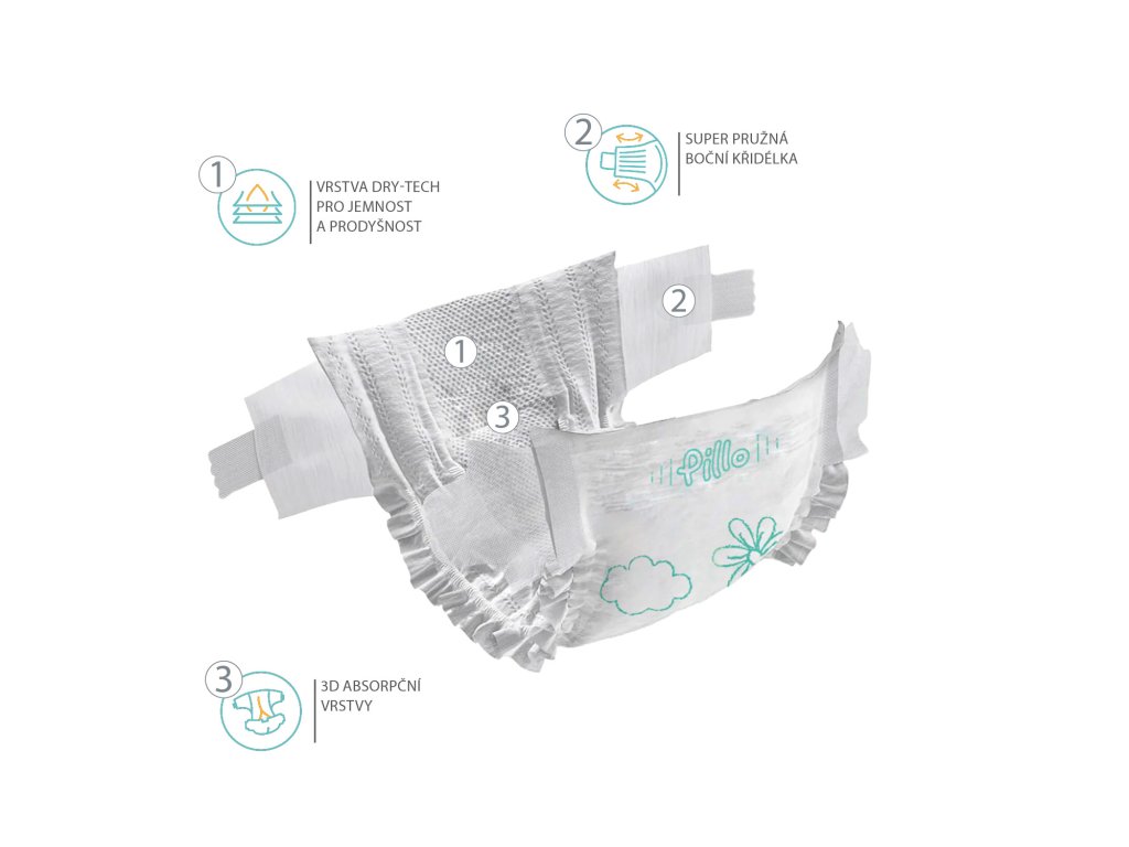 Cieľom našich plienok je nepretržitý komfort vášho dieťatka a udržať ho v suchu až na 12 hodín, čo je ideálne pre celodennú aj nočnú ochranu. Super pružné bočné krídelká poskytujú nielen flexibilitu pre všetky detské dobrodružstvá, ale tiež zaisťujú perfektné prispôsobenie plienky pre každý pohyb. Plienky sú ultra jemné a priedušné vďaka prémiovým materiálom, čo zaisťuje celodenné pohodlie vášho dieťaťa.