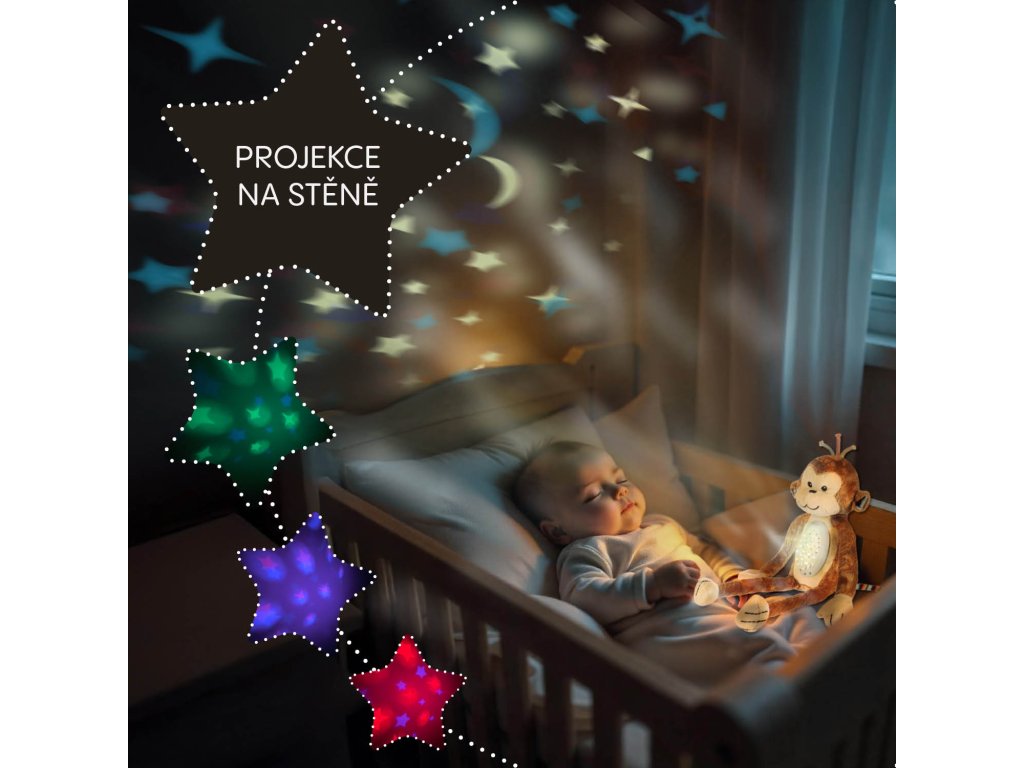 Nočné svetielko premieta kúzelné motívy na stenu a plynule sa meniace RGB farby vytvárajú harmonickú atmosféru. K tomu sa pridáva 10 upokojujúcich melódií, ktoré navodzujú pocit bezpečia a pohody pre pokojné a nerušené zaspávanie.