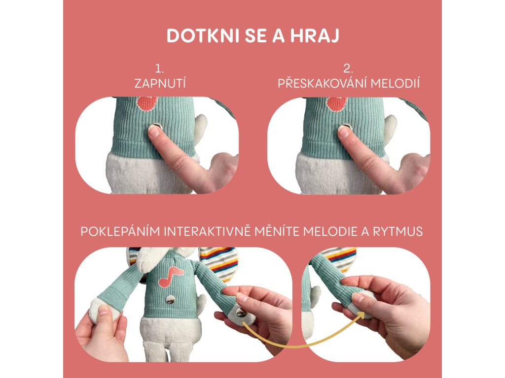 Vďaka mäkkému plyšovému materiálu je hračka ideálna nielen na hranie, ale aj na maznanie a zaspávanie. Bezpečné prevedenie zaručuje, že je vhodná pre deti od 12 mesiacov a poskytuje im hodiny zábavy a objavovania nových zvukov.