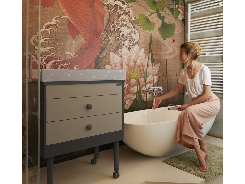 Prebaľovacia komoda obsahuje detskú vaničku s 2 anatomicky tvarovanými sedadlami, z ktorých jedno má sklon ideálny pre deti do 6 mesiacov a druhé od 6 do 12 mesiacov. Vaňa je vybavená zátkou a odtokom na ľahké vypúšťanie vody. Dve priestranné zásuvky ponúkajú dostatok priestoru na uloženie plienok alebo iných detských hygienických potrieb.