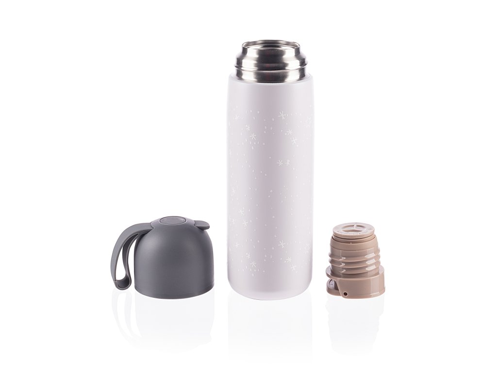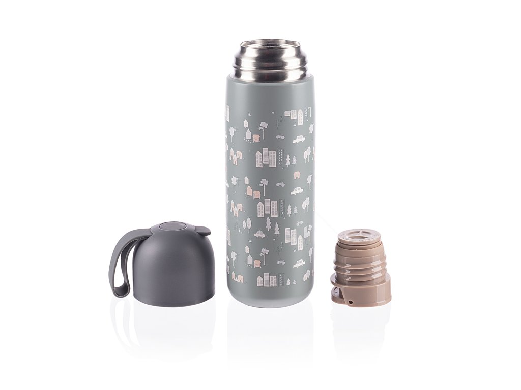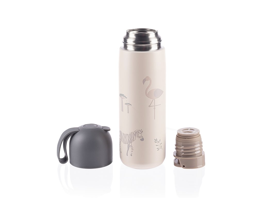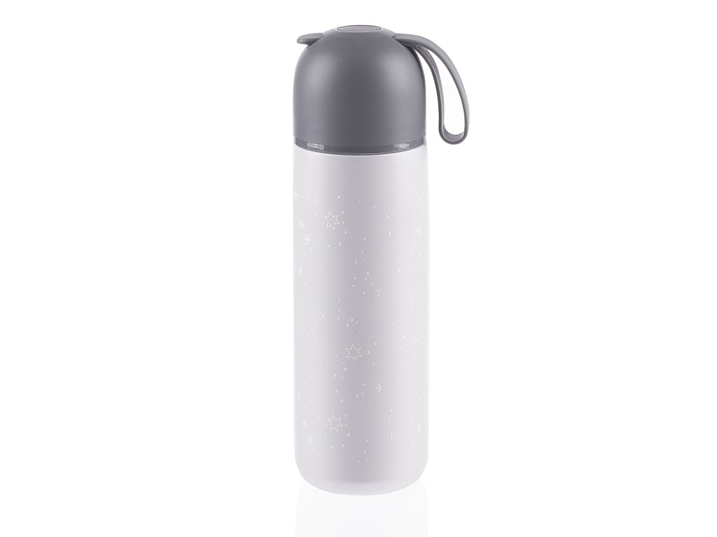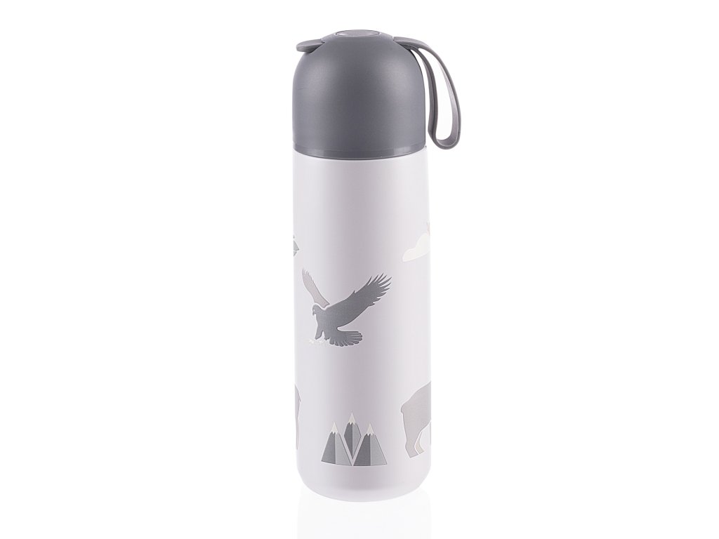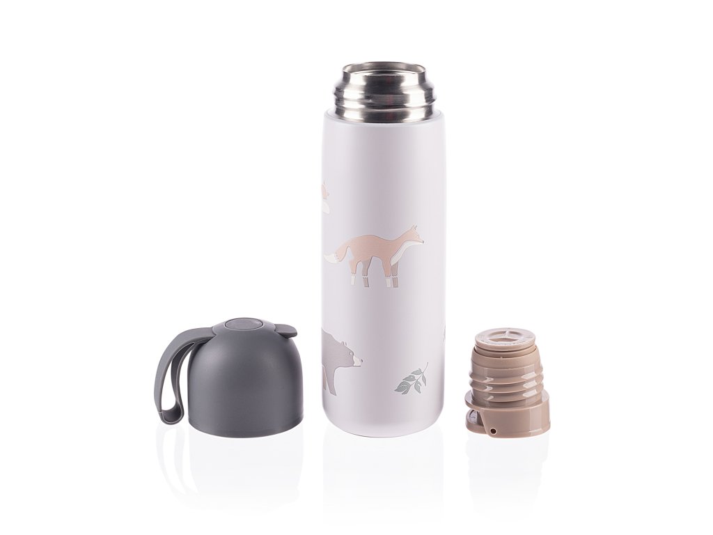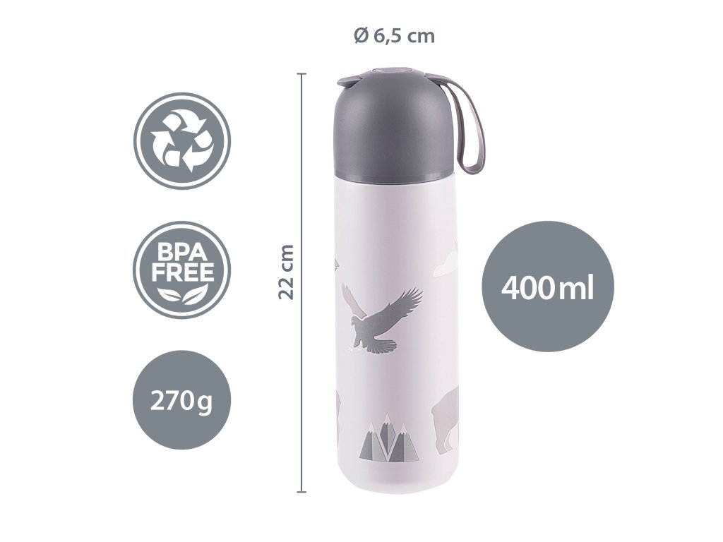 Kvalitná termoska na tekutiny s objemom 400 ml udrží horúce nápoje až 12 hodín, studené nápoje až 24 hodín. Je vyrobená z kvalitnej nehrdzavejúcej ocele, ktorá je odolná proti korózii. Tesne priliehajúce viečko zaisťuje, že termoska nevyteká, a vrchný uzáver na pohodlné nalievanie zaručuje, že sa vám tekutina nevyleje ani pri jazde autom po nerovnej ceste, vďaka dvojitému uzáveru si môžete byť istí aj tým, že dieťa tekutinu z termosky nevyleje. Viečko termosky možno použiť ako hrnček.