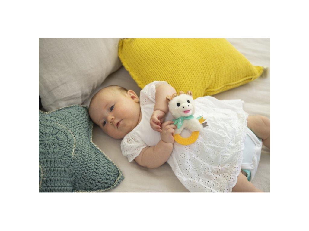Hračka má okolo krku krásny šál výraznej farby s jemnou bielou výšivkou v tvare žirafy a 3 farebné prúžky na manipuláciu. Každá hračka z produktovej rady Sweety Sophie obsahuje modrozelený textilný štítok, ktorý je typickým znakom tejto kolekcie.