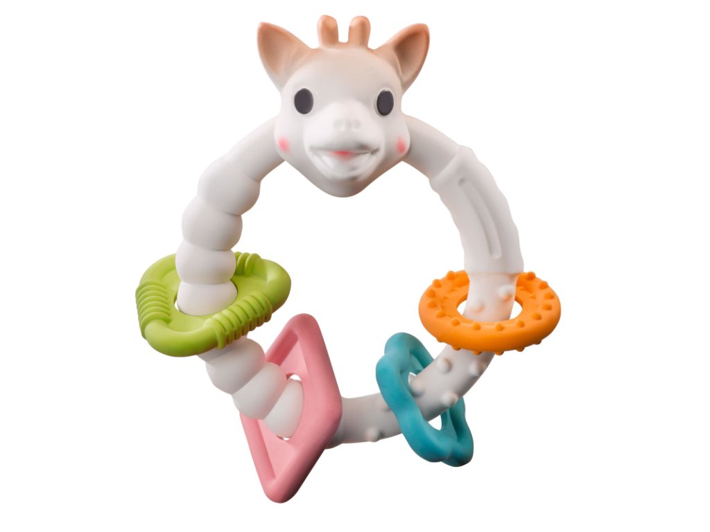 Hračka obsahuje mnoho mäkkých častí určených na hryzenie s rôznymi tvarmi (uši, rohy alebo nos žirafy), ktoré masírujú ďasná a poskytujú dieťaťu úľavu od bolesti pri prerezávaní prvých zúbkov.