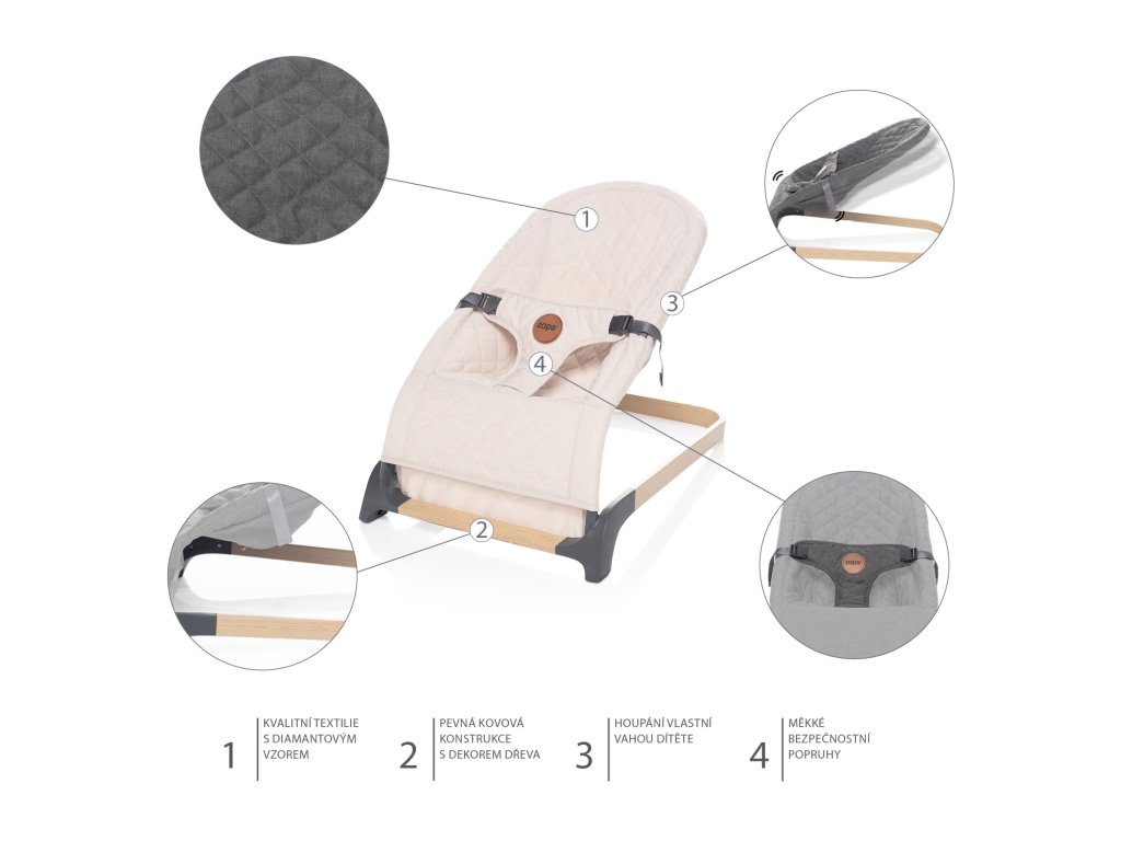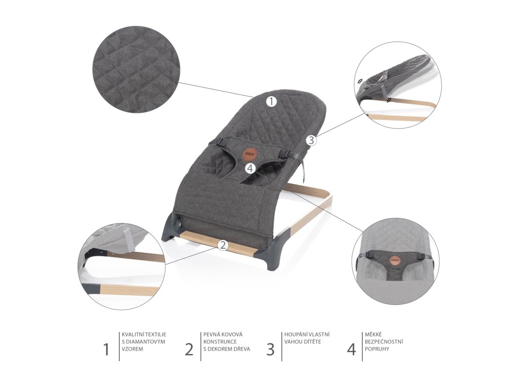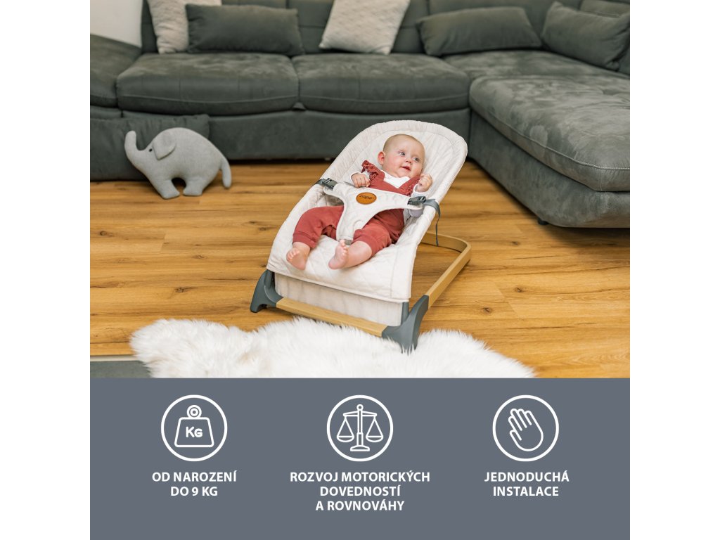 Vďaka pevnej a zároveň pružnej kovovej konštrukcii lehátko umožňuje hojdanie na základe vlastnej váhy dieťaťa alebo dieťa môžu hojdať rodičia. Hojdanie je tak úplne prirodzené. Bábätko sa rýchlo naučí, ako sa v lehátku rozhojdať a rozvíja tak motorické zručnosti a rovnováhu.