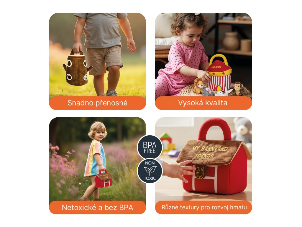 Objavte svet zábavy a učenia s touto plyšovou sadou pre deti. Každý tematický domček ukrýva štyroch milých zvieracích kamarátov a slúži ako hrací kufrík aj rozvojová hračka, ktorá podporuje predstavivosť a jemnú motoriku.