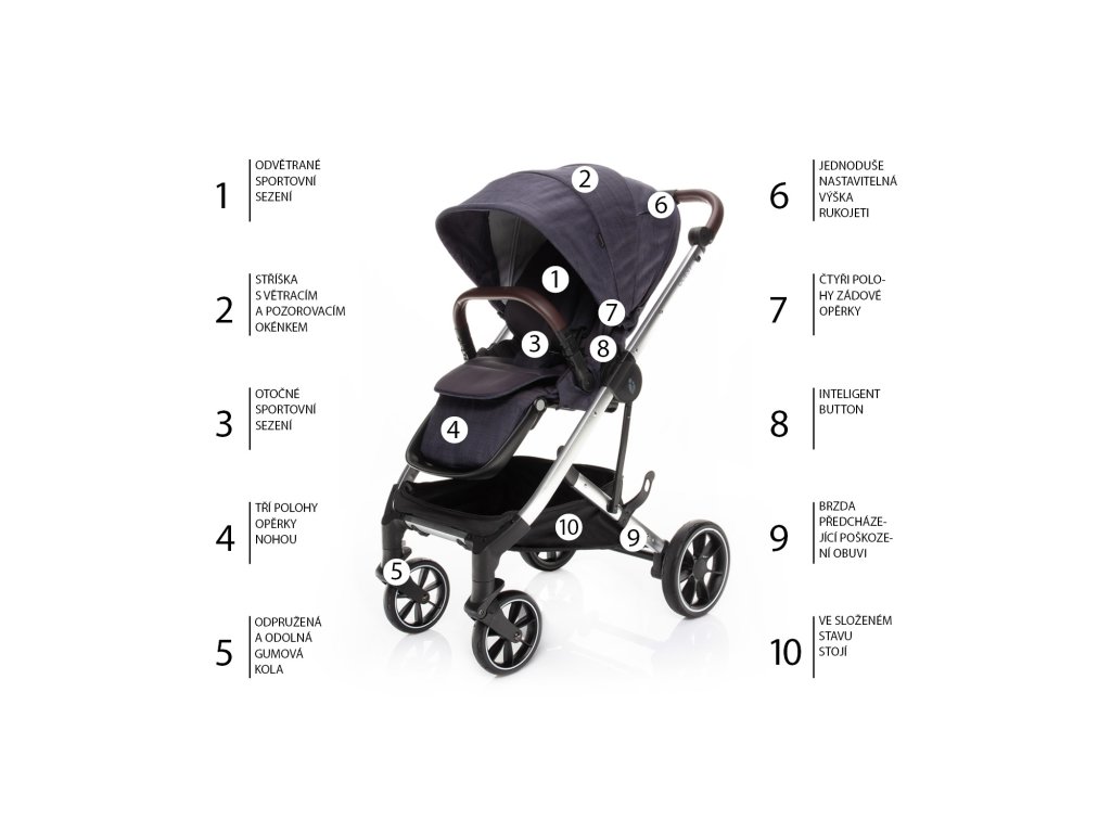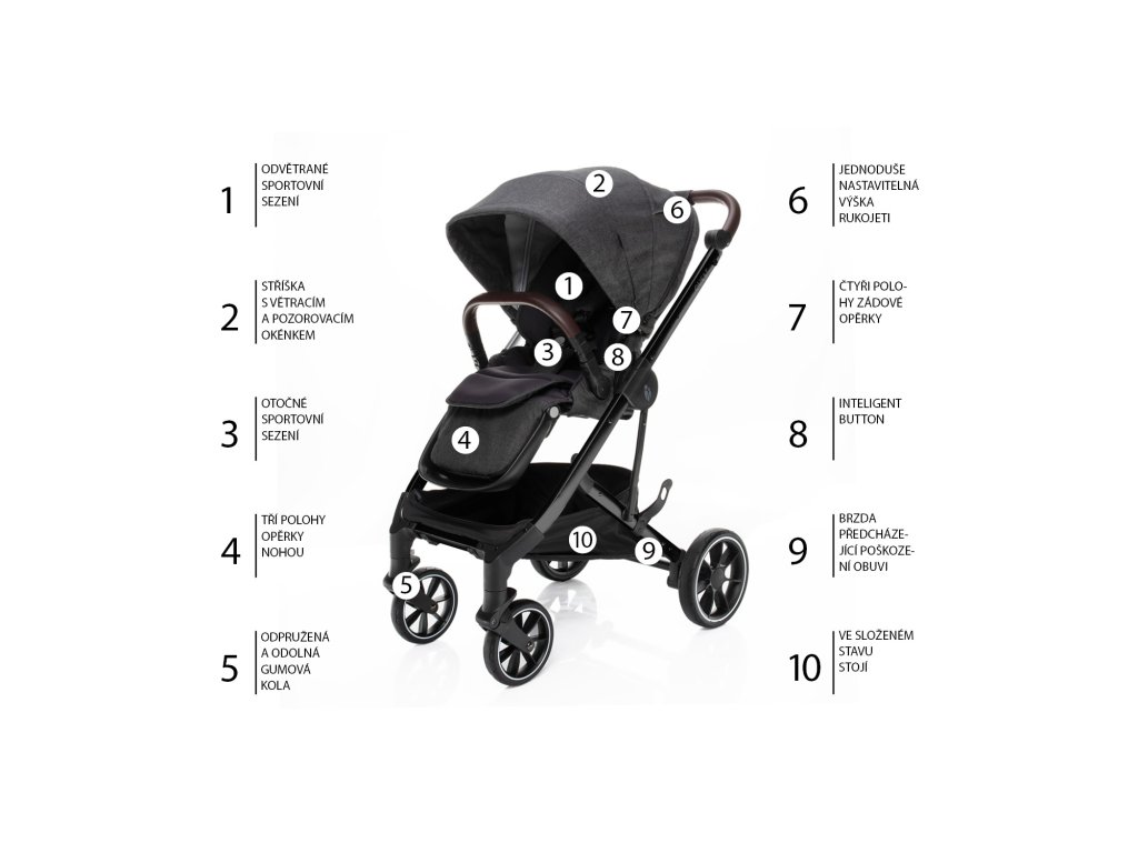 Po zložení kočík stojí sám a vďaka rukoväti a poistke proti zloženiu sa ľahko prenáša. Novinkou je systém inteligentného uzamykania tlačidiel pre plynulú manipuláciu a jednoduchšie vyberanie športového sedadla a karosérie z podvozku.