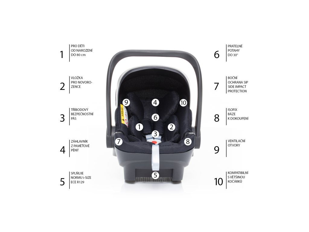Extra dlhá strieška je nezávislá od rukoväte , vďaka tomu môžete používať rukoväť na prenášanie autosedačky aj bez zatiahnutej striešky, či naopak. Strieška chráni dieťa proti ostrému slniečku, vetru prípadnému menšiemu dažďu. Ergonomická rukoväť bola navrhnutá tak, aby čo najviac uľahčila prenášanie. 3 bodové bezpečnostné pásy vám uľahčia upínanie dieťaťa do autosedačky a jednoducho nastaviteľná hlavová opierka dopomôže k ľahkému nastaveniu pohodlia pre vaše dieťatko, pričom sa takto prispôsobí tomu, ako dieťa rastie. Navyše s nastavovaním opierky hlavy rovno nastavujete aj výšku pásov . Pre maximálne pohodlie je hlavová opierka vyplnená pamäťovou penou . V zadnej časti autosedačky je praktické odvetrávanie . Pre komfort novonarodených bábätiek prichádza autosedačka XM s kvalitnou novorodeneckou vložkou s použitím až do 75 cm výšky dieťaťa.