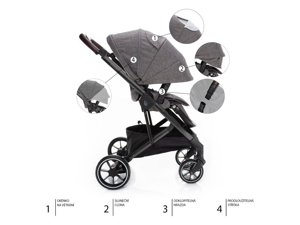 Po zložení kočík stojí samostatne. Vďaka rukoväti sa ľahko prenáša. Novinkou je systém inteligentného uzamykania tlačidiel pre plynulú manipuláciu a jednoduchšie vyberanie športového sedadla a karosérie z podvozku.
