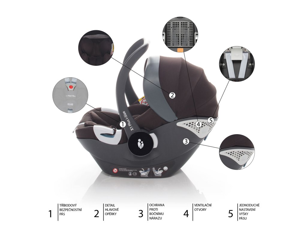 Extra dlhá strieška je nezávislá od rukoväte , vďaka tomu môžete používať rukoväť na prenášanie autosedačky aj bez zatiahnutej striešky, či naopak. Strieška chráni dieťa proti ostrému slniečku, vetru prípadnému menšiemu dažďu. Ergonomická rukoväť bola navrhnutá tak, aby čo najviac uľahčila prenášanie. 3 bodové bezpečnostné pásy vám uľahčia upínanie dieťaťa do autosedačky a jednoducho nastaviteľná hlavová opierka dopomôže k ľahkému nastaveniu pohodlia pre vaše dieťatko, pričom sa takto prispôsobí tomu, ako dieťa rastie. Navyše s nastavovaním opierky hlavy rovno nastavujete aj výšku pásu . Pre maximálne pohodlie je hlavová opierka vyplnená pamäťovou penou . V zadnej časti autosedačky je praktické odvetrávanie . Pre komfort novonarodených bábätiek prichádza autosedačka XM s kvalitnou novorodeneckou vložkou až do 75 cm výšky dieťaťa.