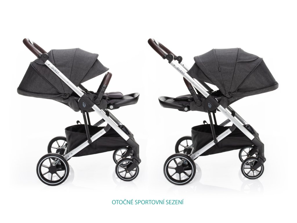 Kočík Quest sa môže pochváliť kvalitným odpružením všetkých 4 kolies a automatickou aretáciou predných kolies. Kolesá sú veľké a odolné proti prepichnutiu. Brzdový pedál je navrhnutý tak, aby ste si nepoškodili obuv, pedál sa spúšťa zhora.