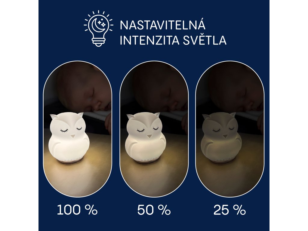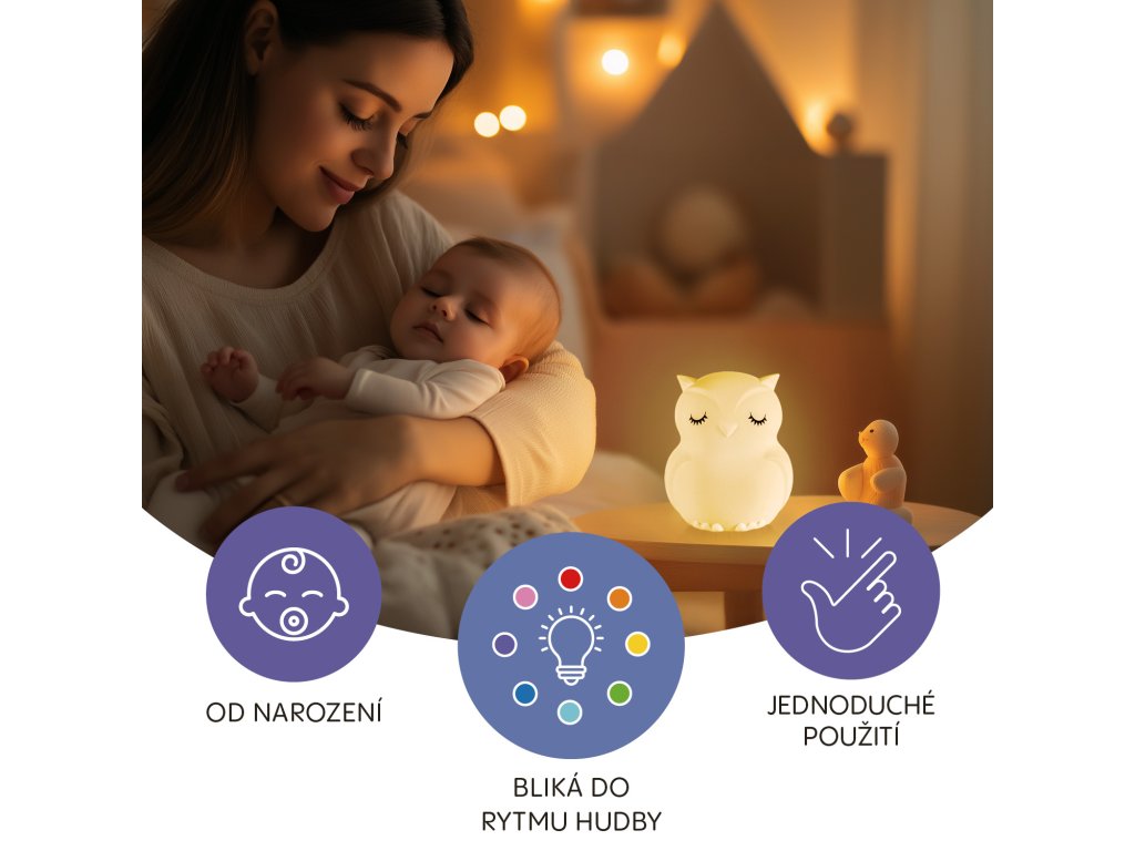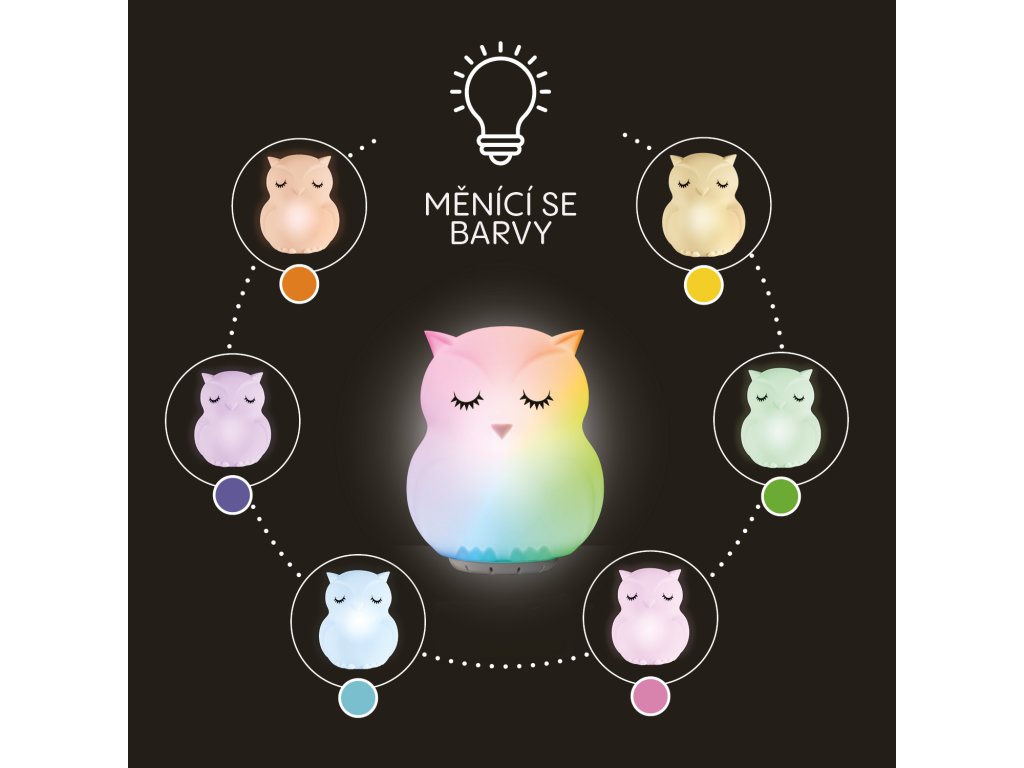 Lampička ponúka stmievateľné biele svetlo, ktoré ľahko prispôsobíte aktuálnym potrebám, ako je čítanie rozprávok, nočné dojčenie alebo prebaľovanie, bez toho, aby ste rušili dieťatko ostrým svetlom. Na vytvorenie hravejšej atmosféry umožňuje plynulé prechody medzi farbami, ktoré možno jednoducho meniť jemným poklepaním alebo zastaviť na obľúbenej farbe. Vďaka svetielku sa vaše dieťatko bude cítiť bezpečne a pomôže mu s pokojnejším zaspávaním.