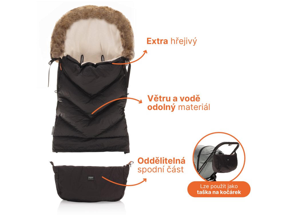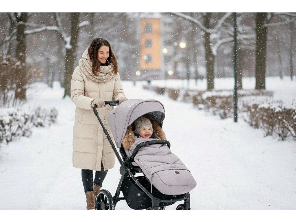 Hrejivý fusak v štýlovom dizajne vhodný do hlbokého aj športového kočíka. Fusak chráni dieťa pred chladným počasím, dažďom aj ostrým vetrom vďaka vrchnému materiálu odolnému proti vetru a vode a extra hrejivej vložke, ktorá je doplnená o kožušinový lem.